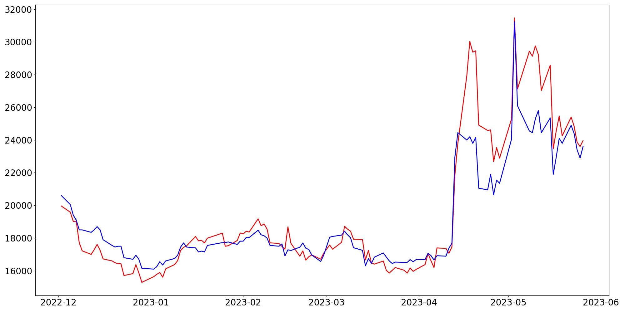[ - : 실제값(종가) / - : 예측값(종가) ]