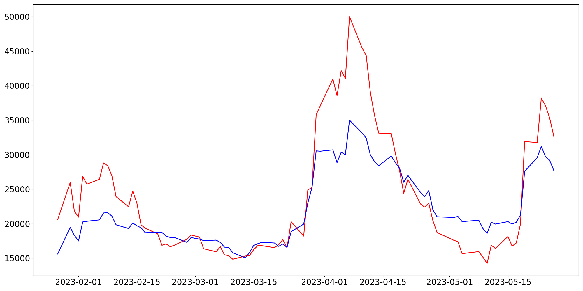 [ - : 실제값(종가) / - : 예측값(종가) ]