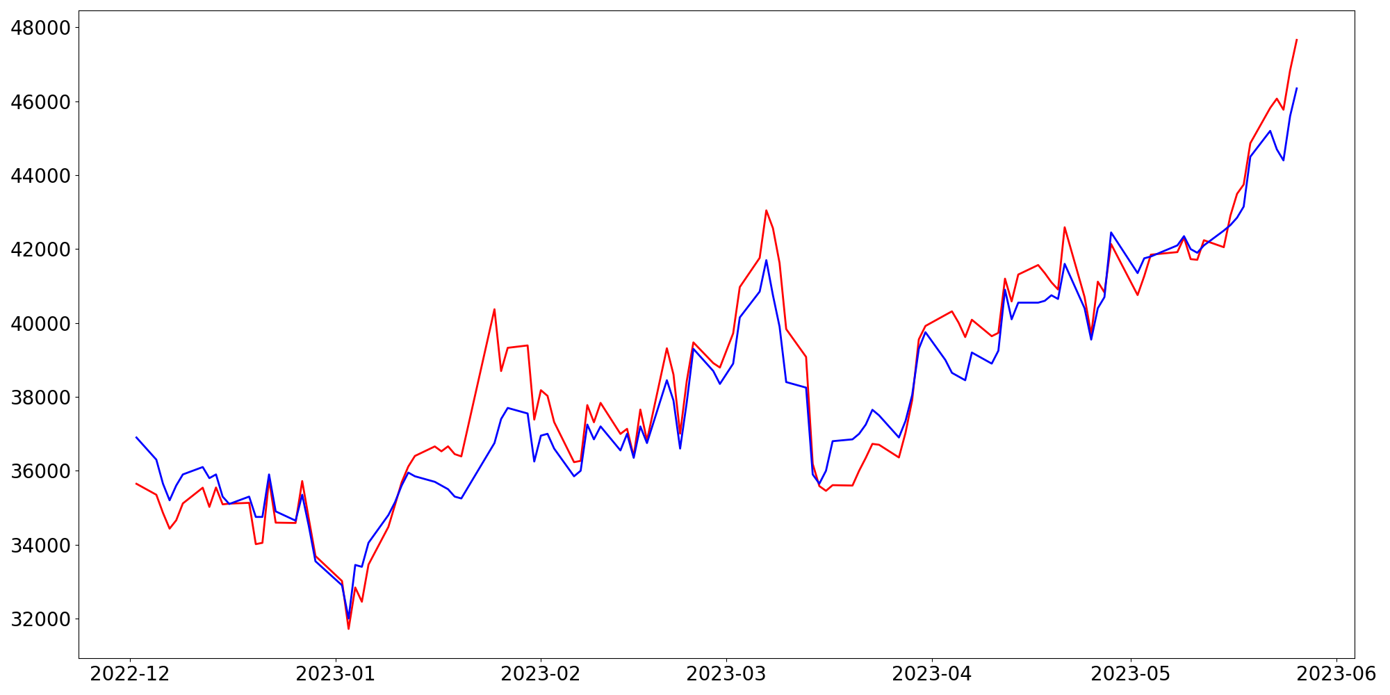[ - : 실제값(종가) / - : 예측값(종가) ]