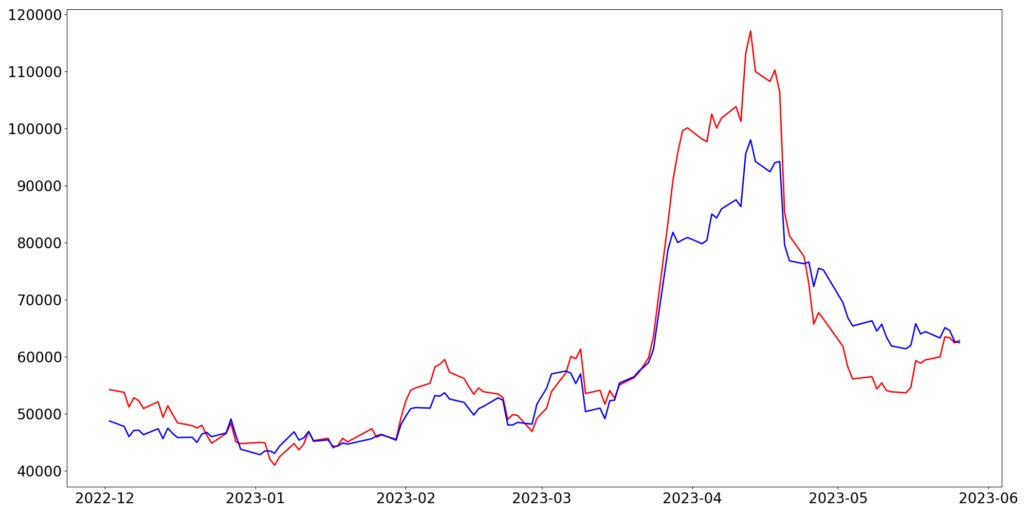 [ - : 실제값(종가) / - : 예측값(종가) ]