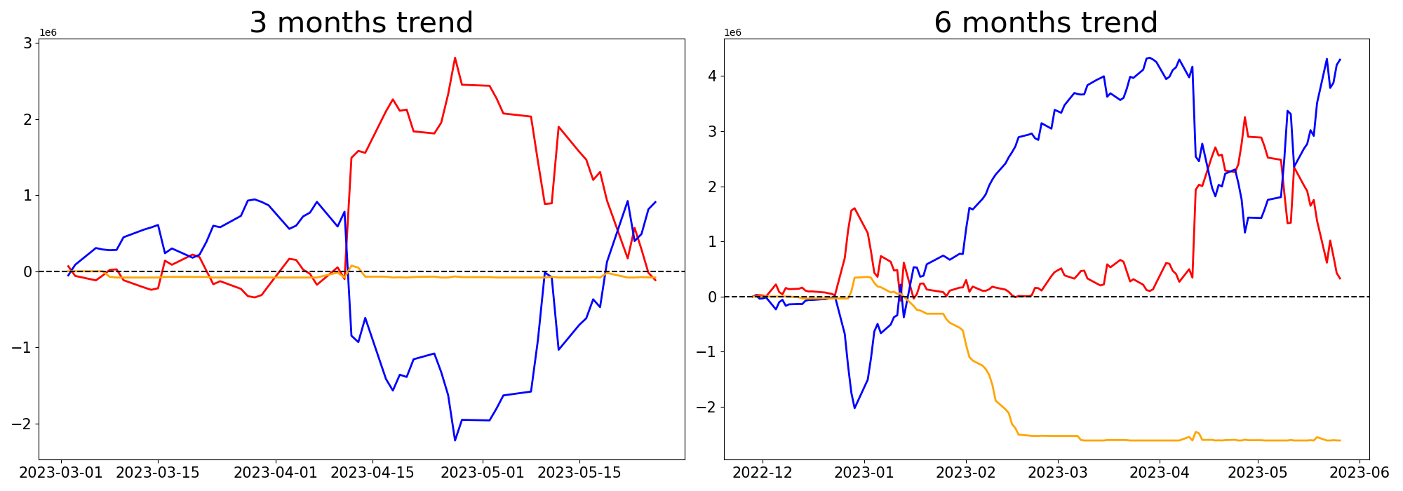 기관, 개인, 외국인으로 분류하여 투자주체별 일정기간동안의 누적적 매수/매도 현황을 분석한 내용입니다. 특정일의 투자자별 매매동향을 통해서 단기간의 시장충격여부를 판단할 수 있으며 장기적인 매매동향을 통해서 해당 종목의 장기 모멘텀을 판단해 볼 수 있습니다.