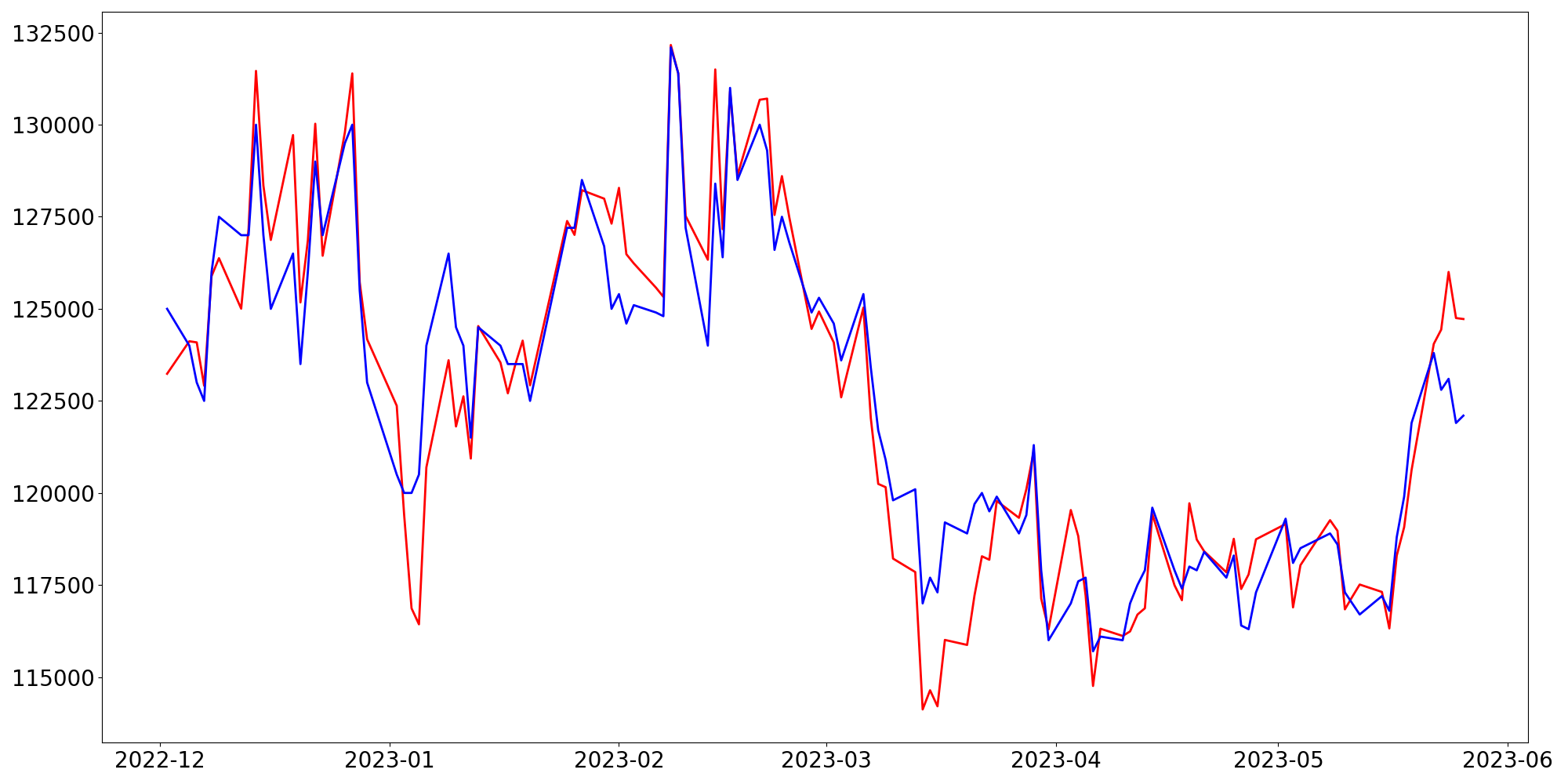 [ - : 실제값(종가) / - : 예측값(종가) ]