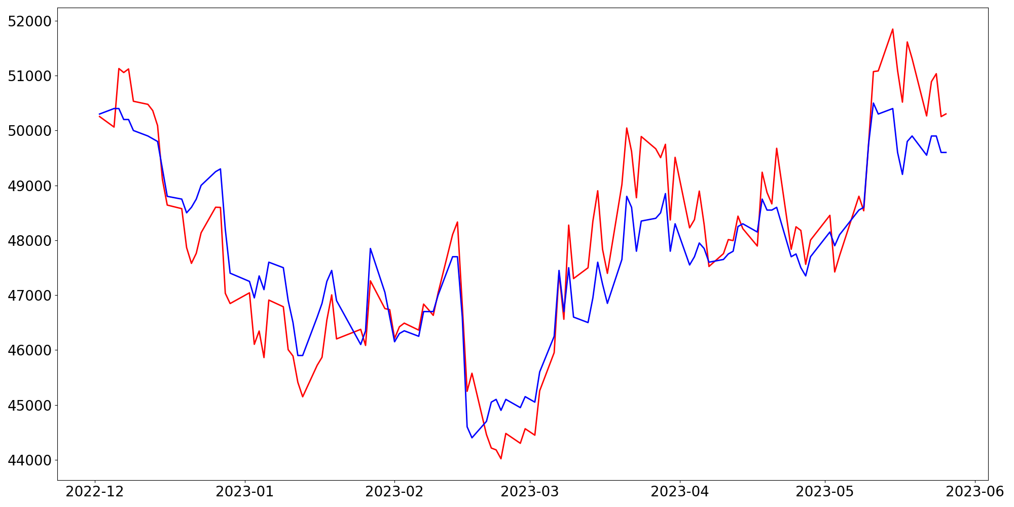 [ - : 실제값(종가) / - : 예측값(종가) ]