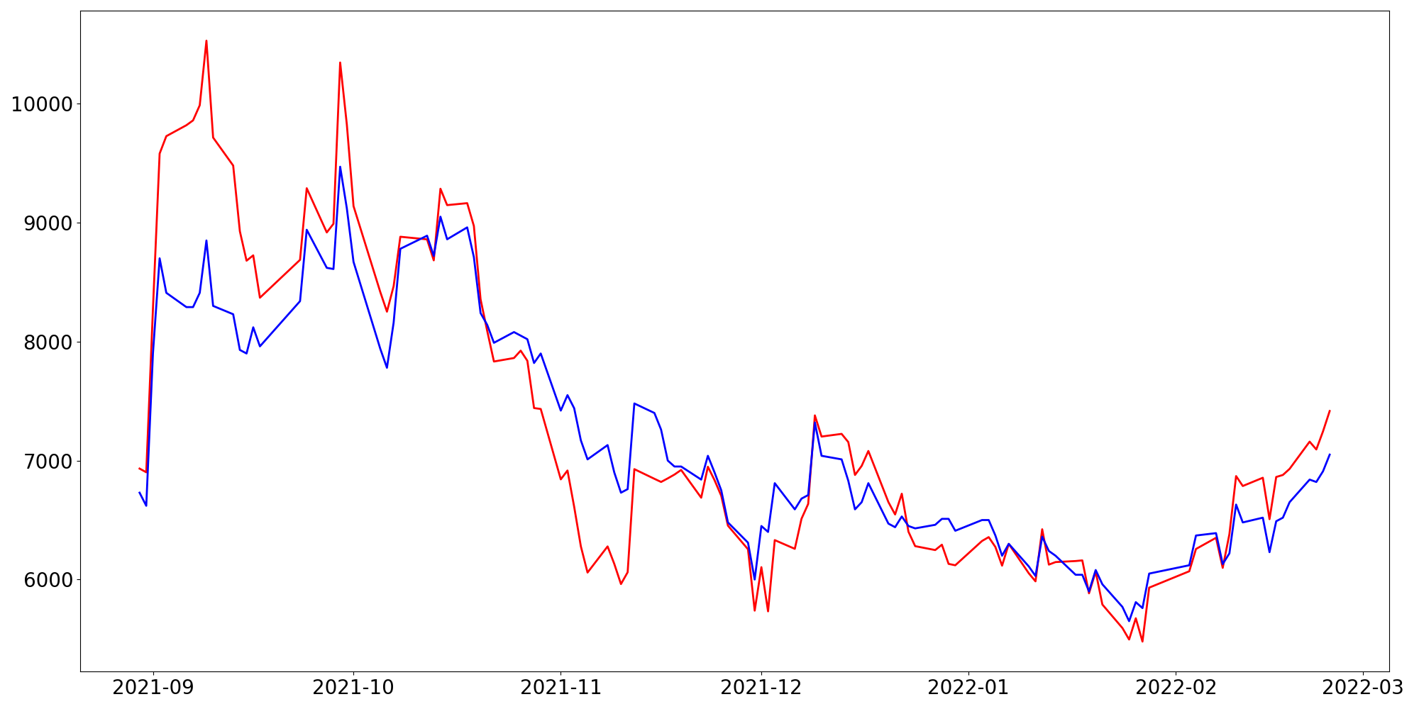 [ - : 실제값(종가) / - : 예측값(종가) ]