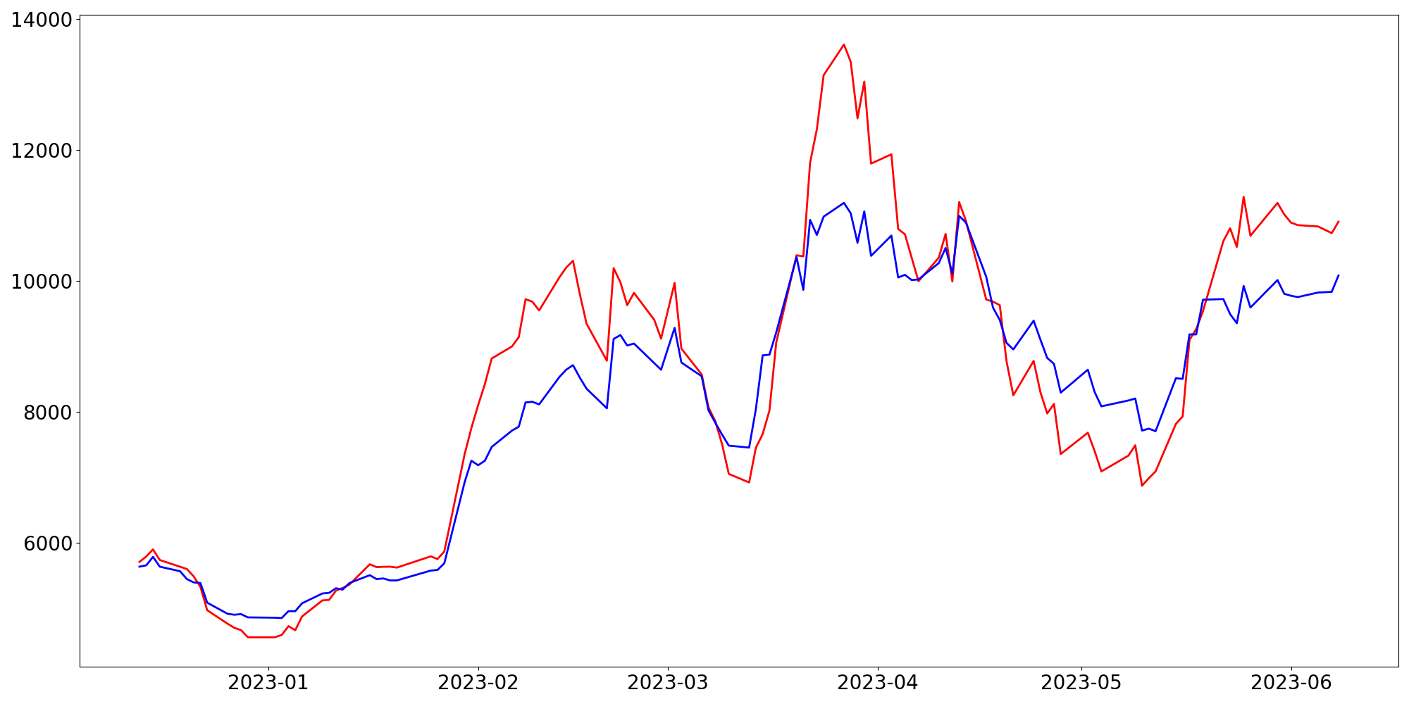 [ - : 실제값(종가) / - : 예측값(종가) ]