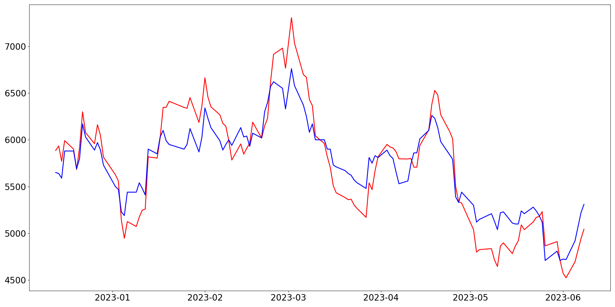 [ - : 실제값(종가) / - : 예측값(종가) ]