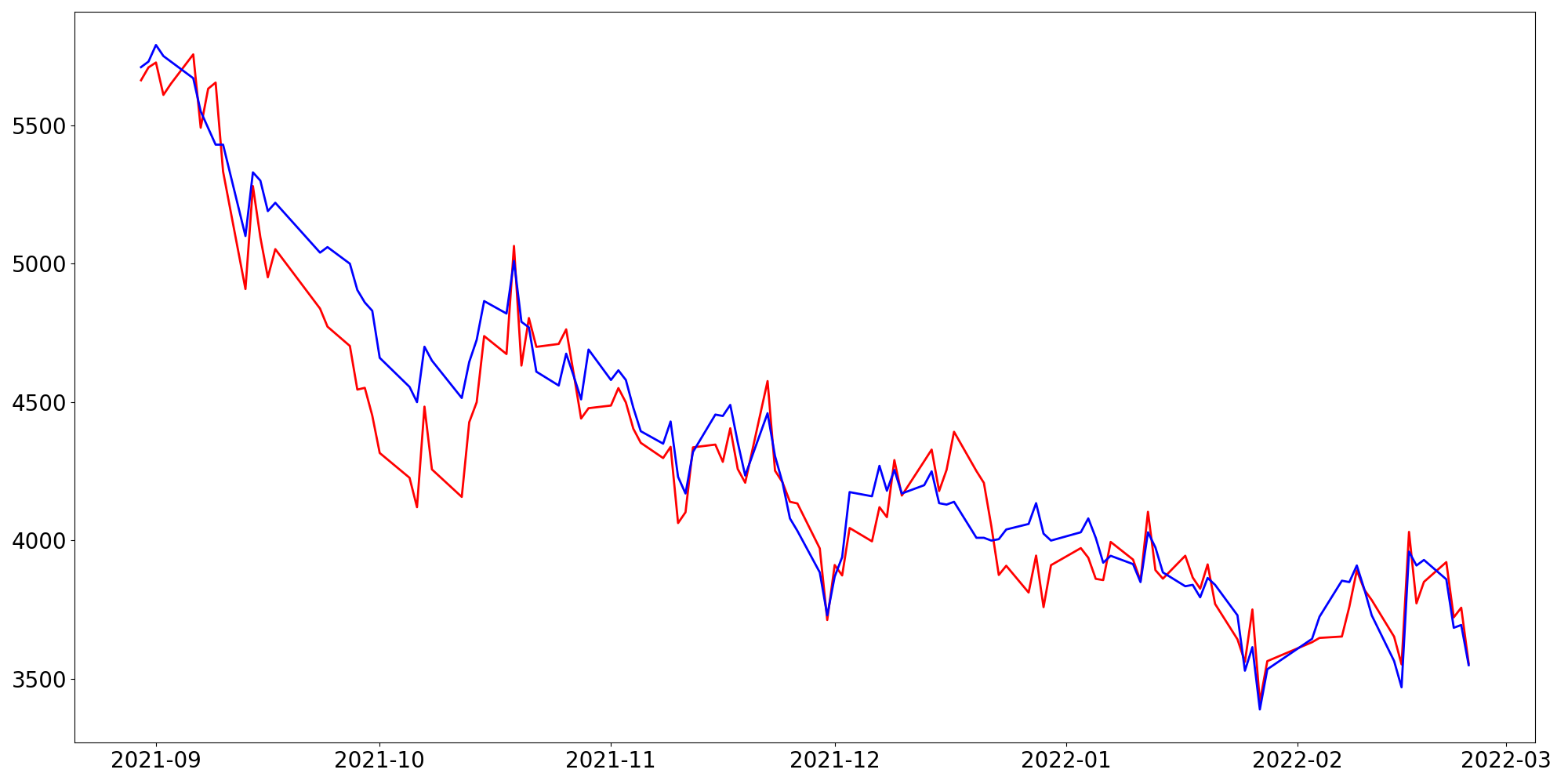 [ - : 실제값(종가) / - : 예측값(종가) ]