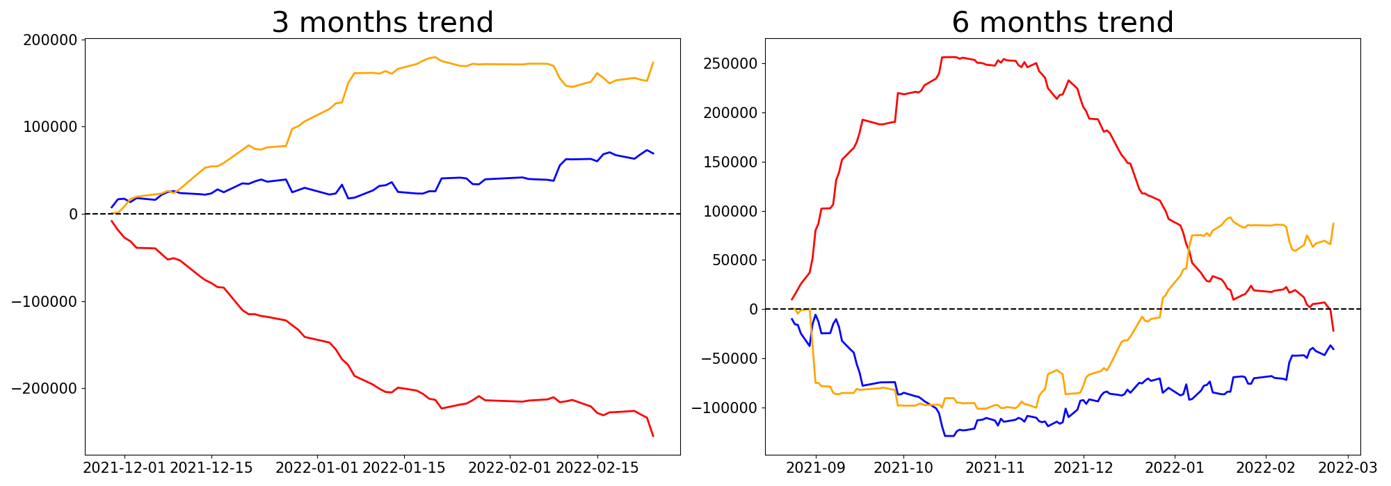 기관, 개인, 외국인으로 분류하여 투자주체별 일정기간동안의 누적적 매수/매도 현황을 분석한 내용입니다. 특정일의 투자자별 매매동향을 통해서 단기간의 시장충격여부를 판단할 수 있으며 장기적인 매매동향을 통해서 해당 종목의 장기 모멘텀을 판단해 볼 수 있습니다.