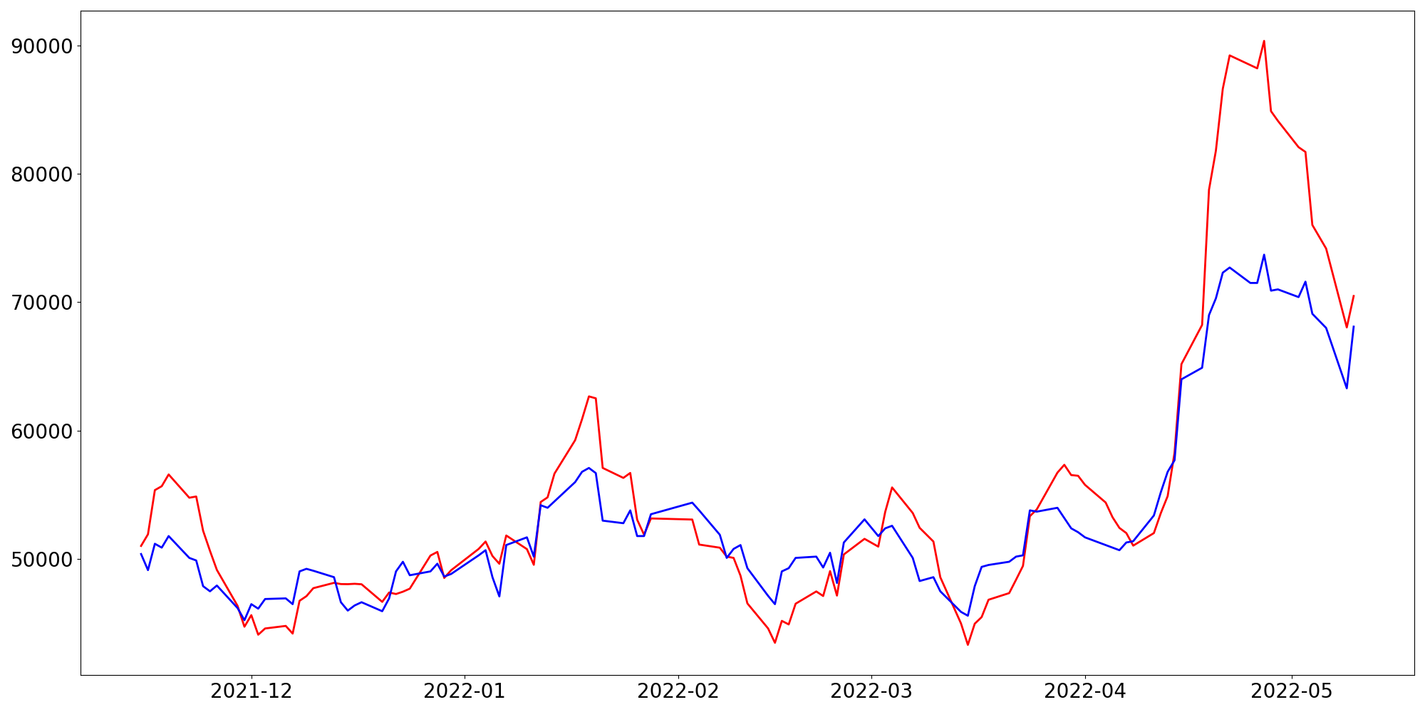 [ - : 실제값(종가) / - : 예측값(종가) ]