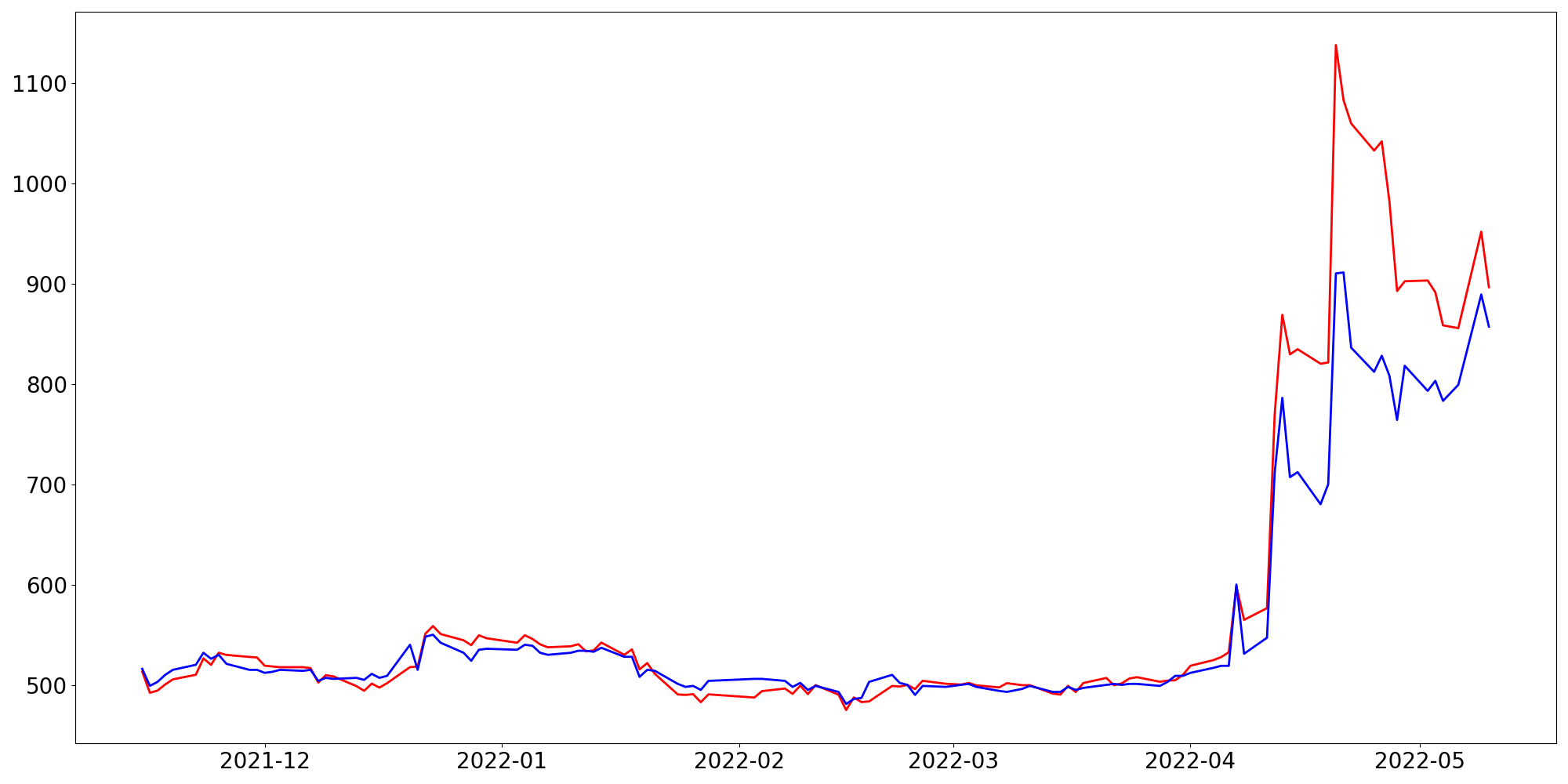 [ - : 실제값(종가) / - : 예측값(종가) ]