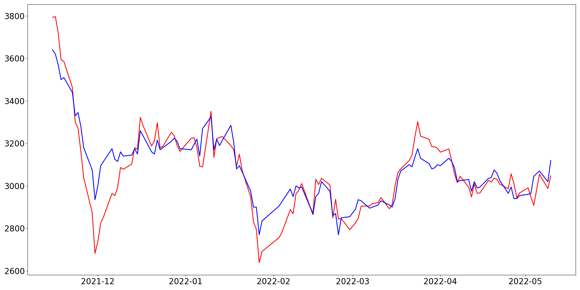 [ - : 실제값(종가) / - : 예측값(종가) ]