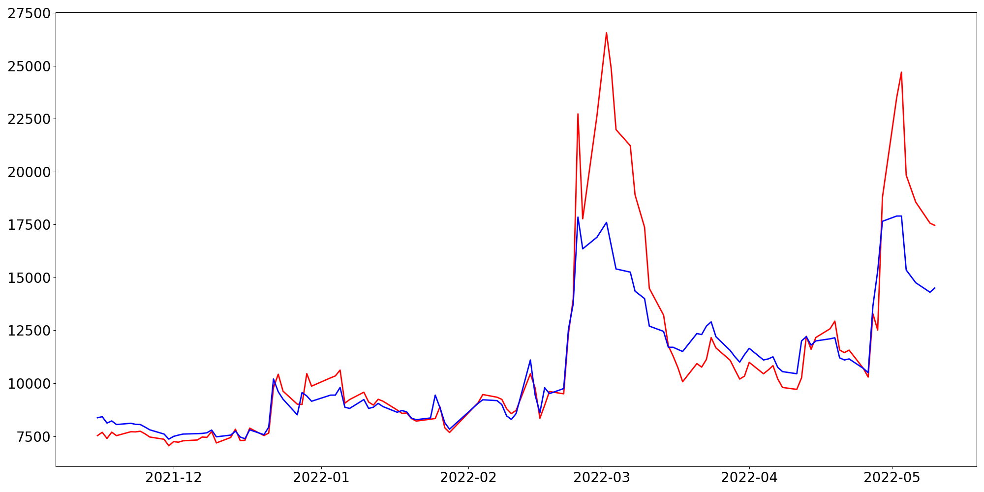 [ - : 실제값(종가) / - : 예측값(종가) ]
