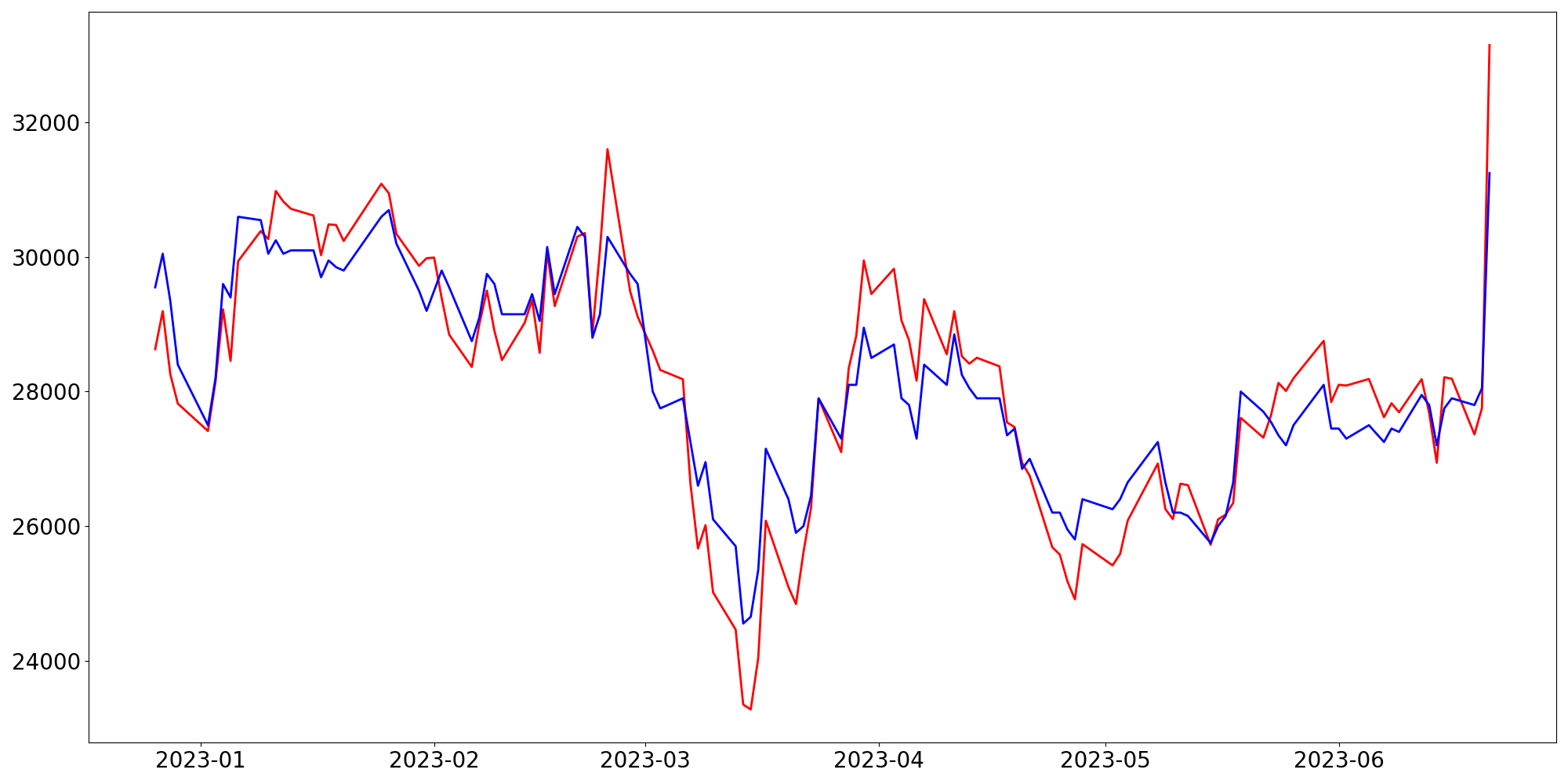 [ - : 실제값(종가) / - : 예측값(종가) ]