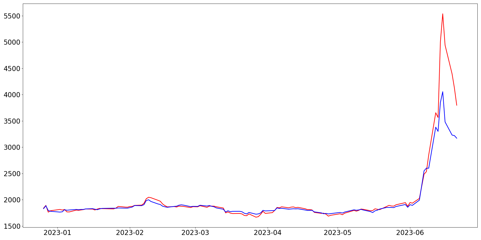 [ - : 실제값(종가) / - : 예측값(종가) ]