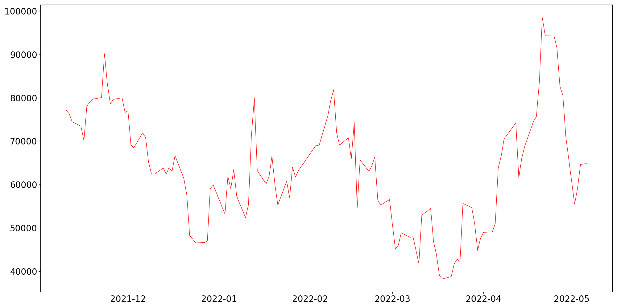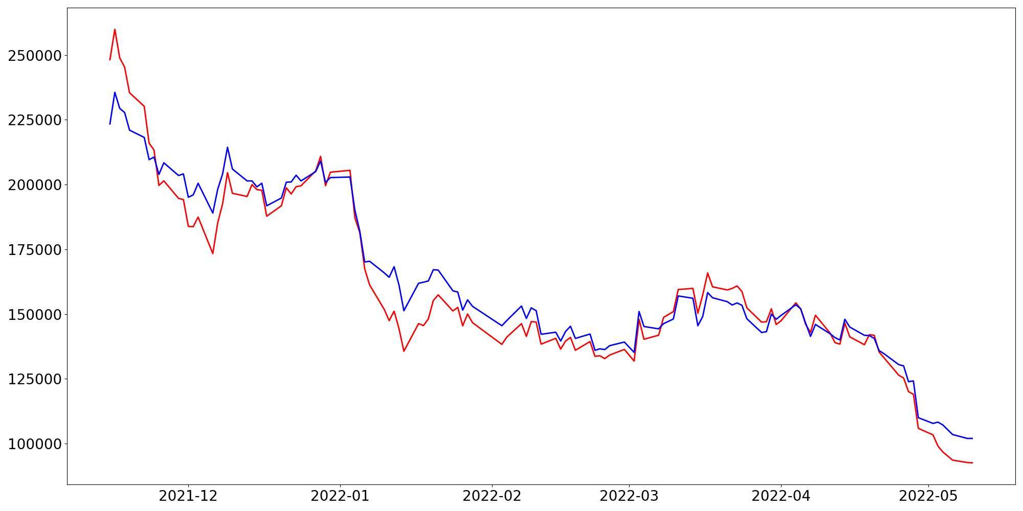 [ - : 실제값(종가) / - : 예측값(종가) ]