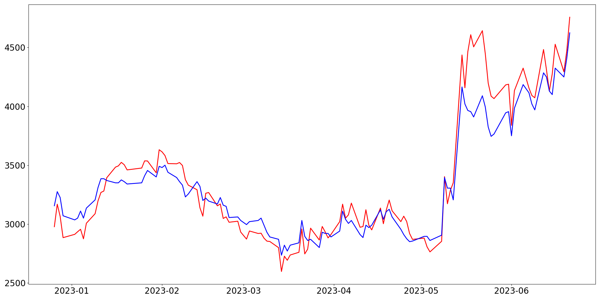 [ - : 실제값(종가) / - : 예측값(종가) ]