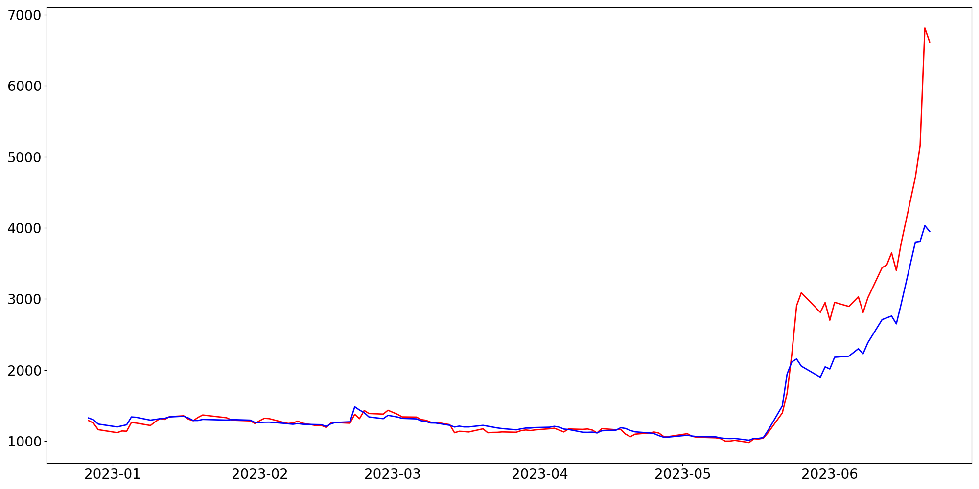 [ - : 실제값(종가) / - : 예측값(종가) ]