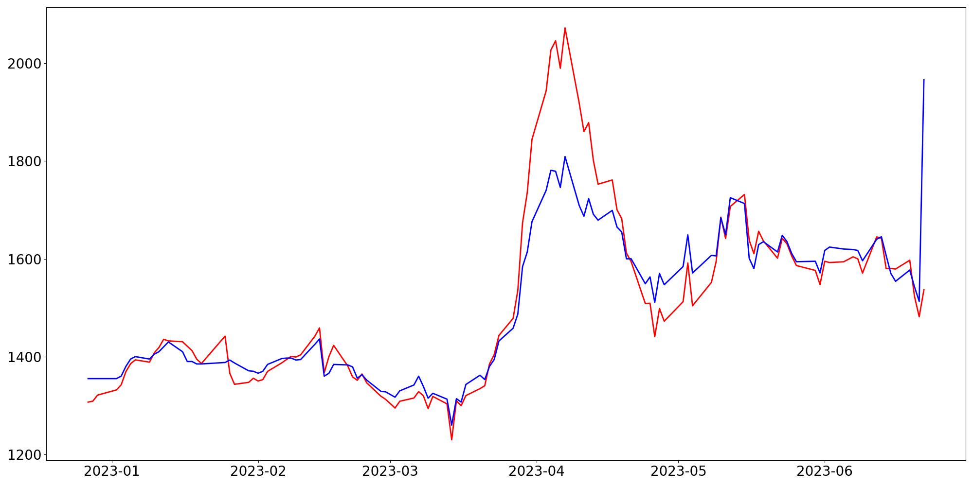 [ - : 실제값(종가) / - : 예측값(종가) ]