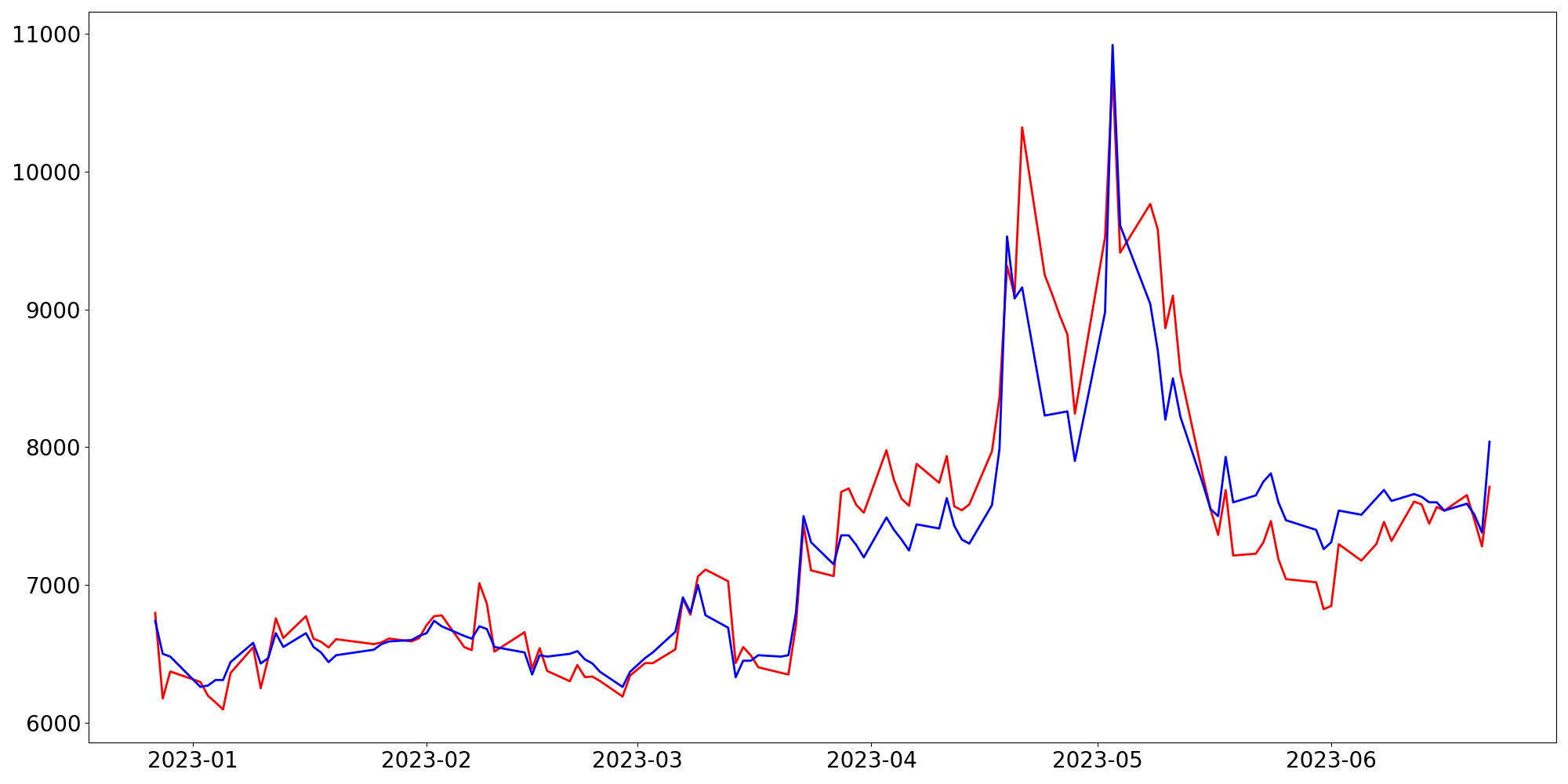 [ - : 실제값(종가) / - : 예측값(종가) ]