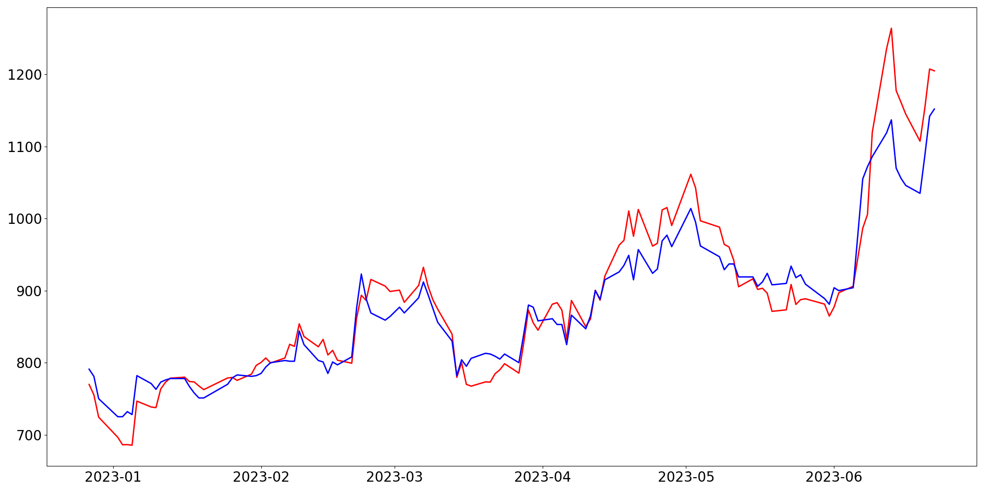 [ - : 실제값(종가) / - : 예측값(종가) ]