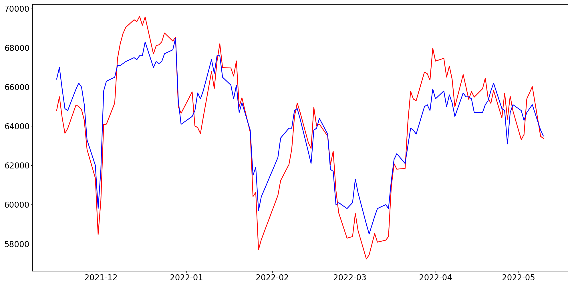 [ - : 실제값(종가) / - : 예측값(종가) ]