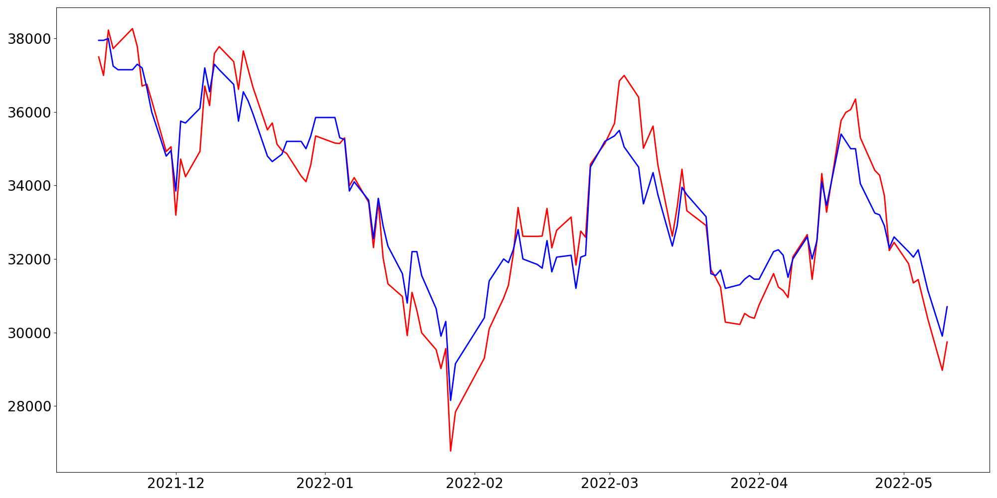 [ - : 실제값(종가) / - : 예측값(종가) ]