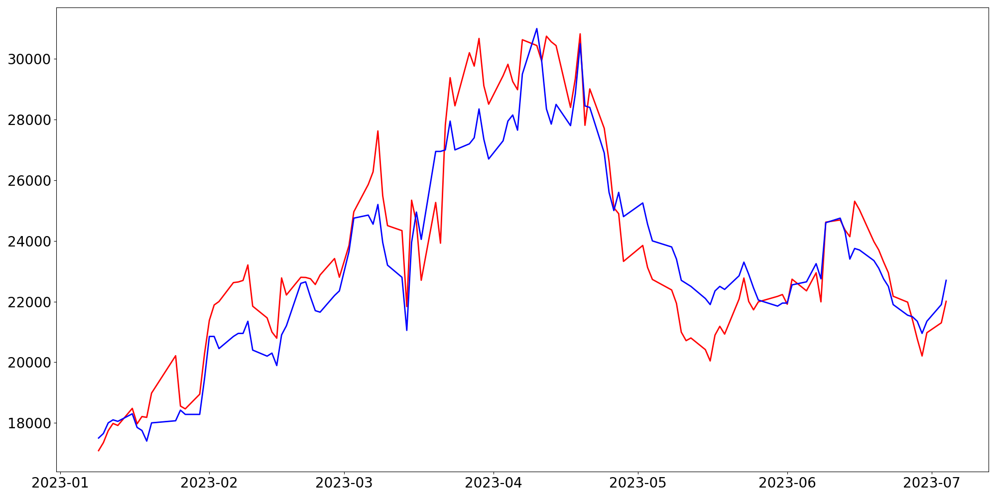 [ - : 실제값(종가) / - : 예측값(종가) ]