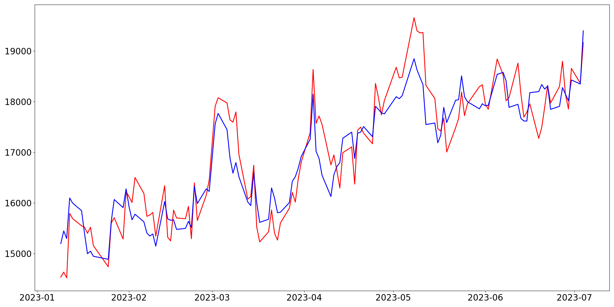 [ - : 실제값(종가) / - : 예측값(종가) ]