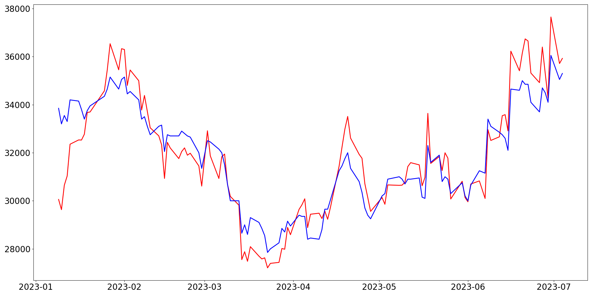 [ - : 실제값(종가) / - : 예측값(종가) ]