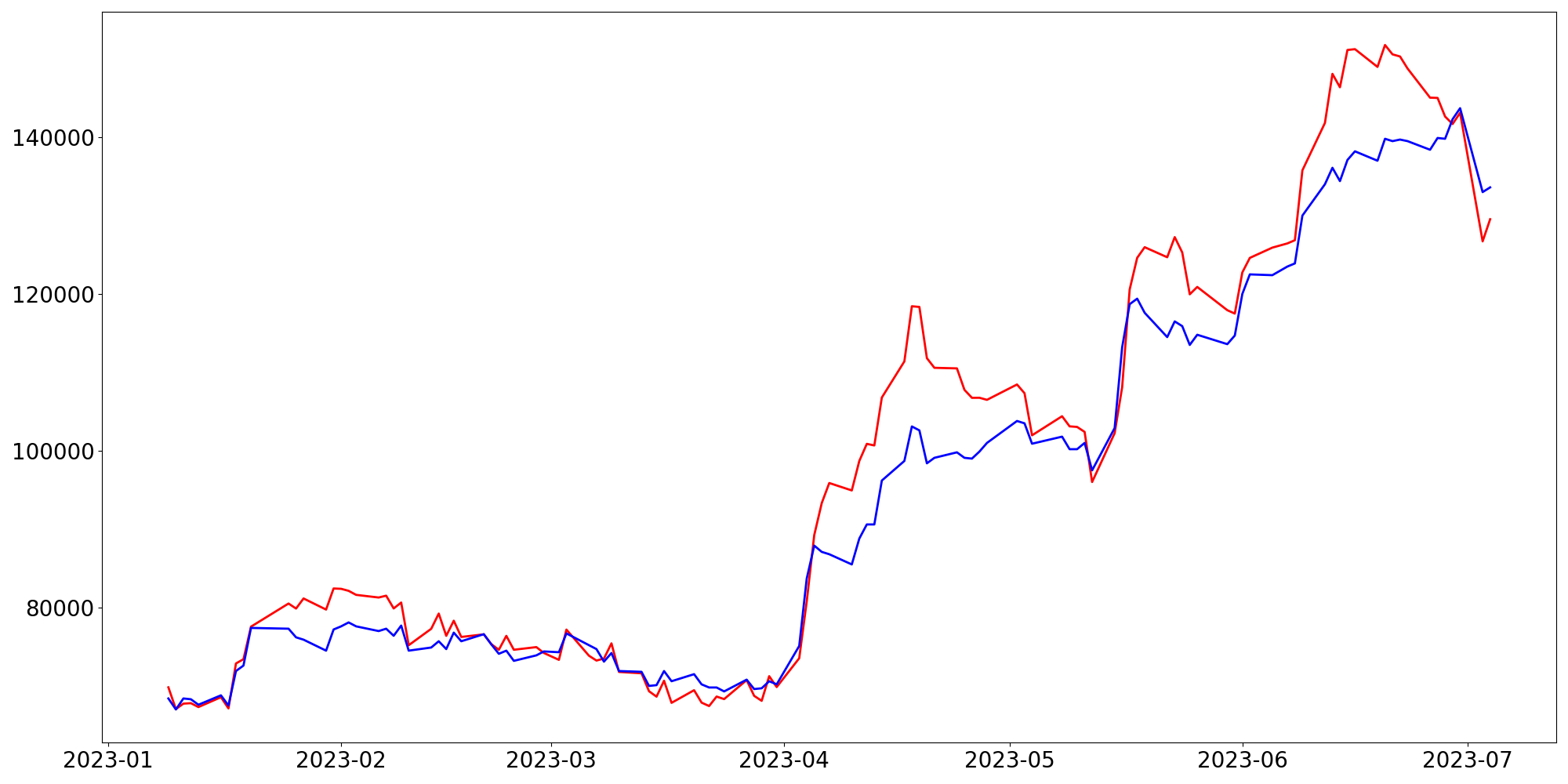[ - : 실제값(종가) / - : 예측값(종가) ]