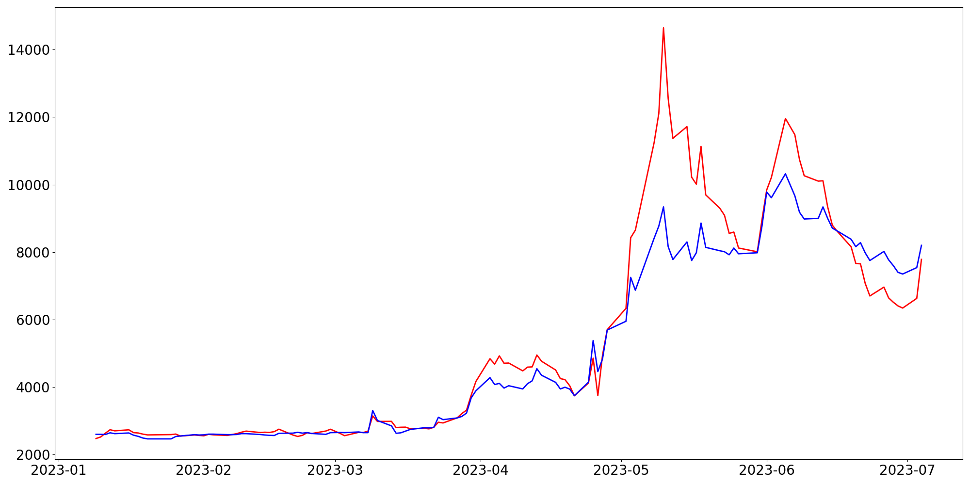 [ - : 실제값(종가) / - : 예측값(종가) ]