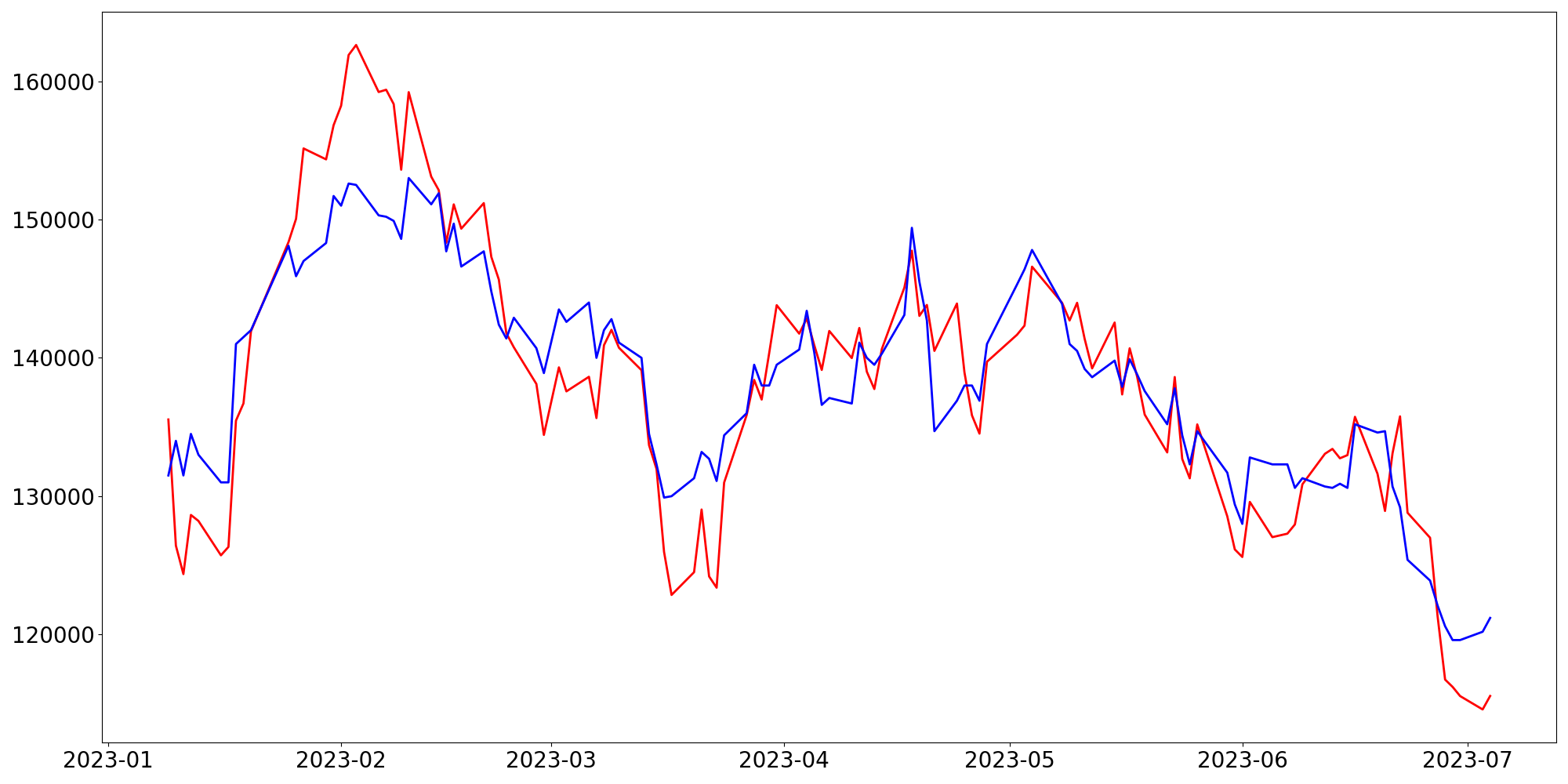 [ - : 실제값(종가) / - : 예측값(종가) ]