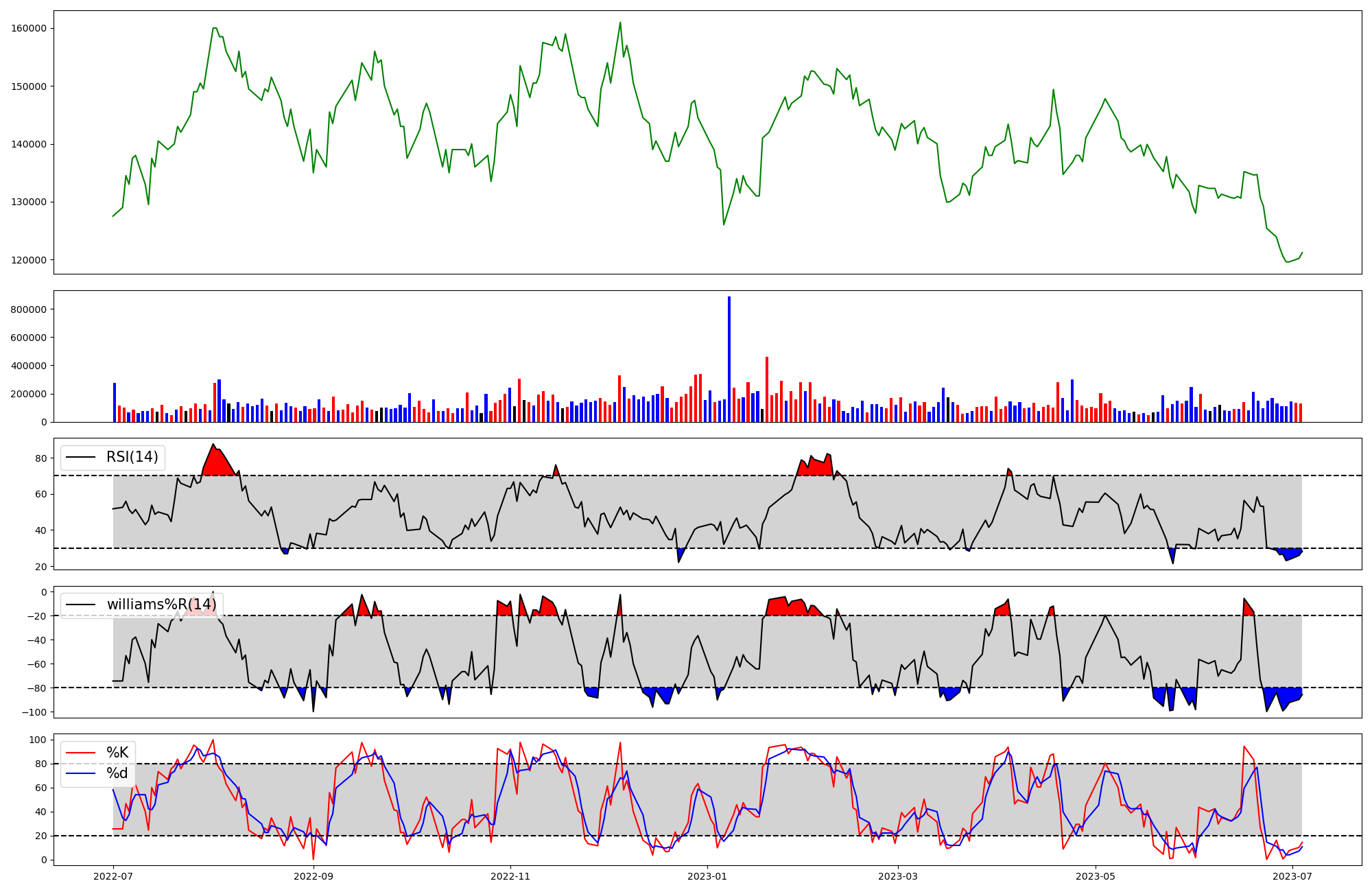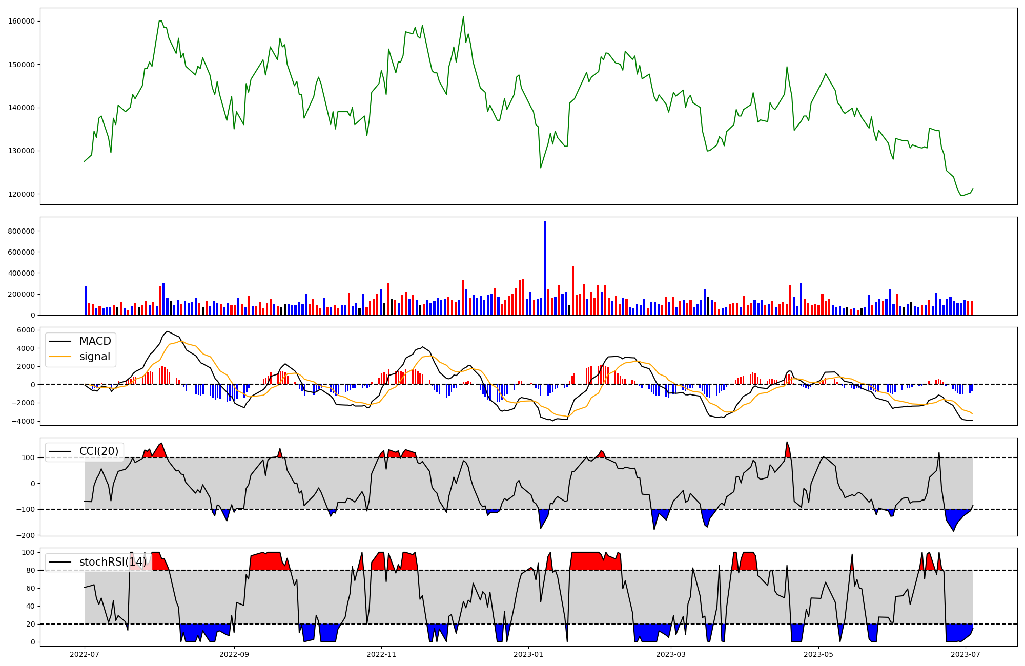 □ 중기 : 현재 종가가 중기(60일) 이동평균값(134,947원)을 하회 하여 중기적 추세 하락 중