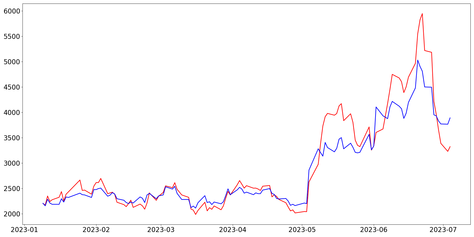 [ - : 실제값(종가) / - : 예측값(종가) ]