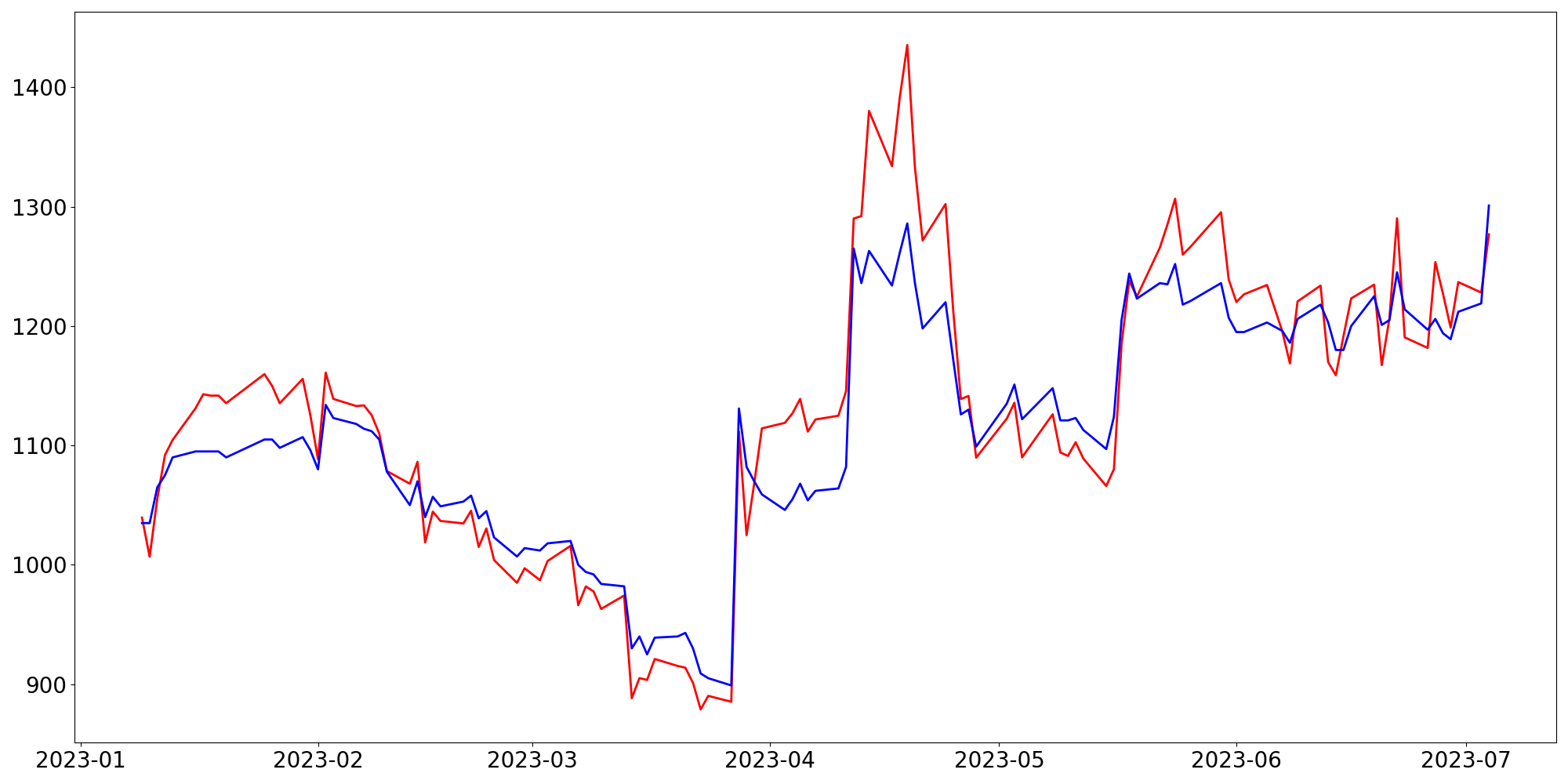 [ - : 실제값(종가) / - : 예측값(종가) ]