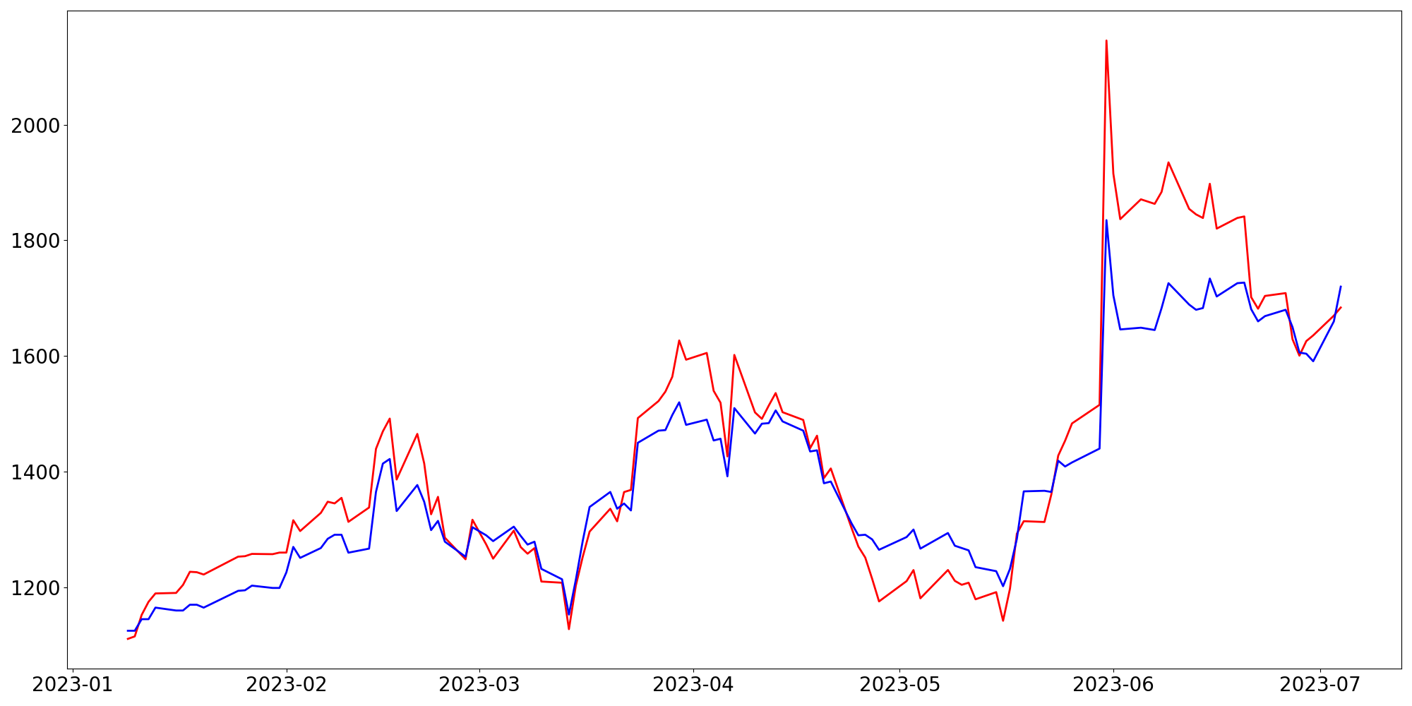 [ - : 실제값(종가) / - : 예측값(종가) ]