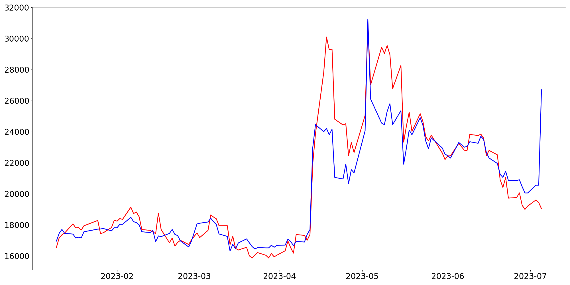 [ - : 실제값(종가) / - : 예측값(종가) ]