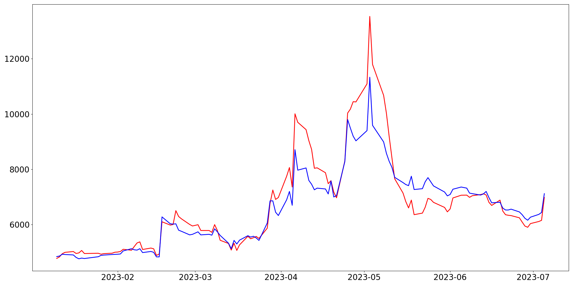 [ - : 실제값(종가) / - : 예측값(종가) ]