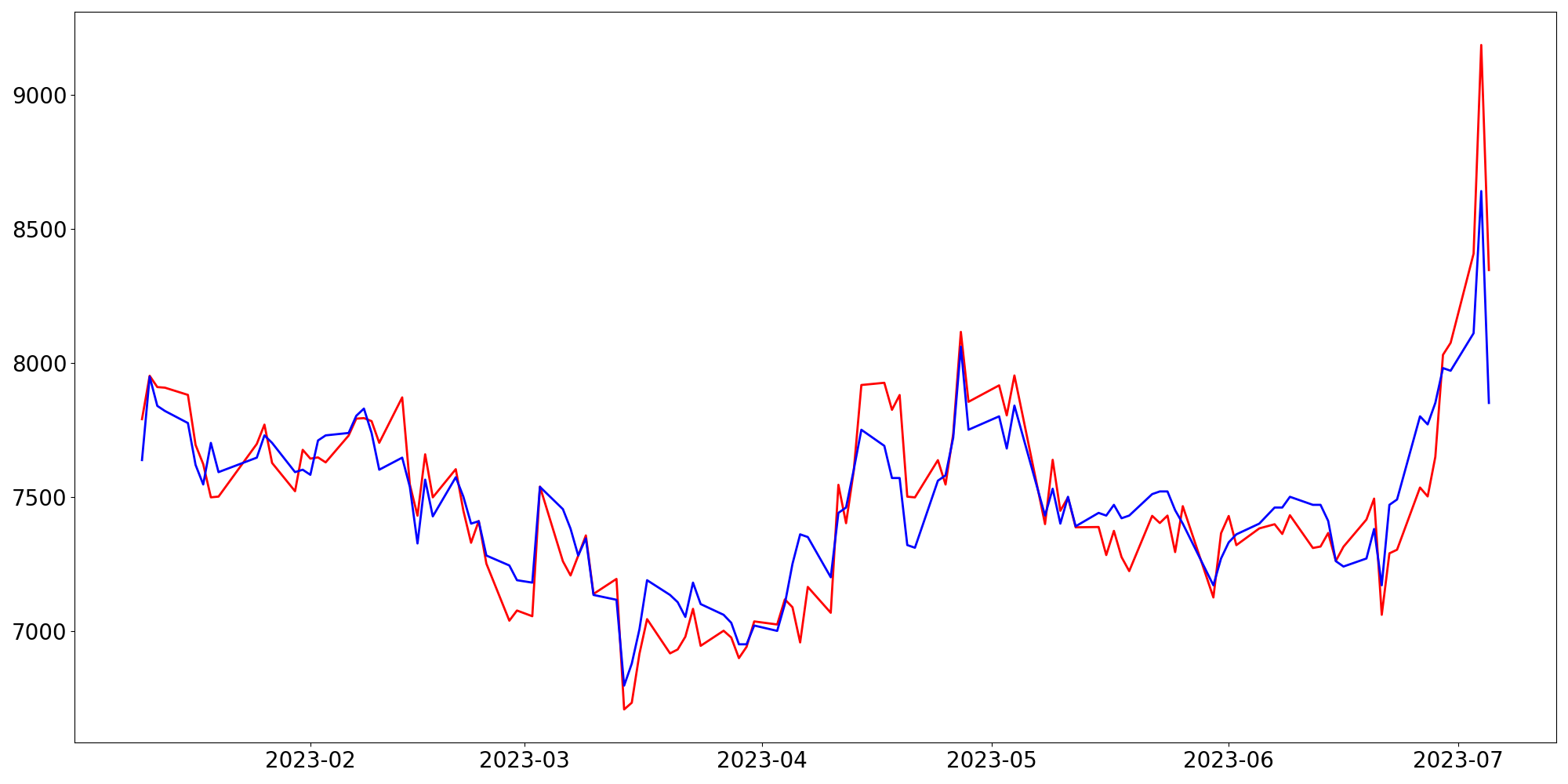 [ - : 실제값(종가) / - : 예측값(종가) ]