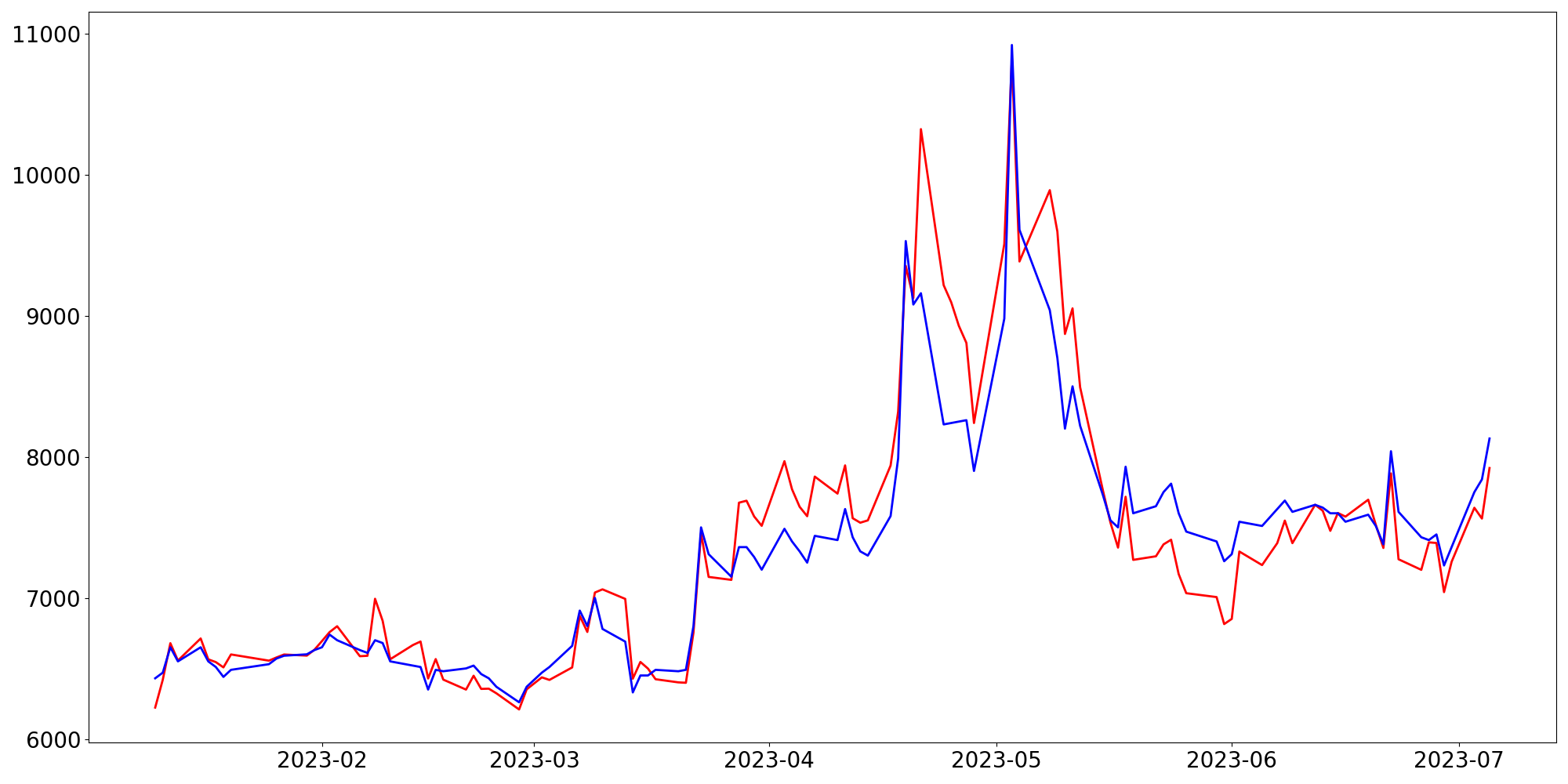 [ - : 실제값(종가) / - : 예측값(종가) ]