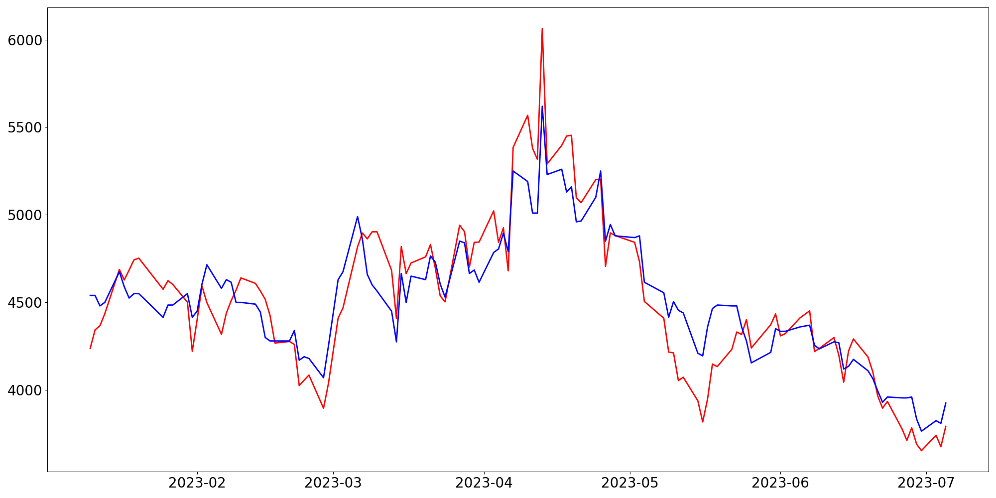 [ - : 실제값(종가) / - : 예측값(종가) ]