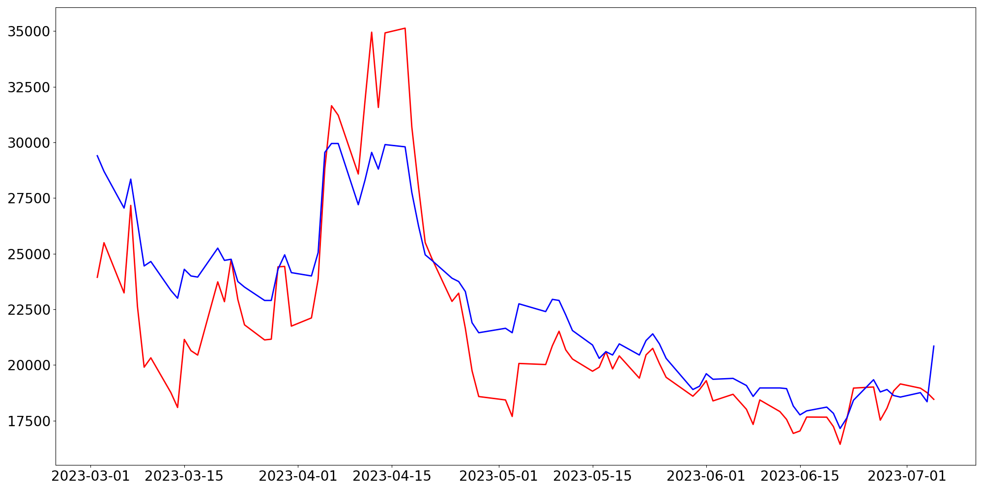 [ - : 실제값(종가) / - : 예측값(종가) ]