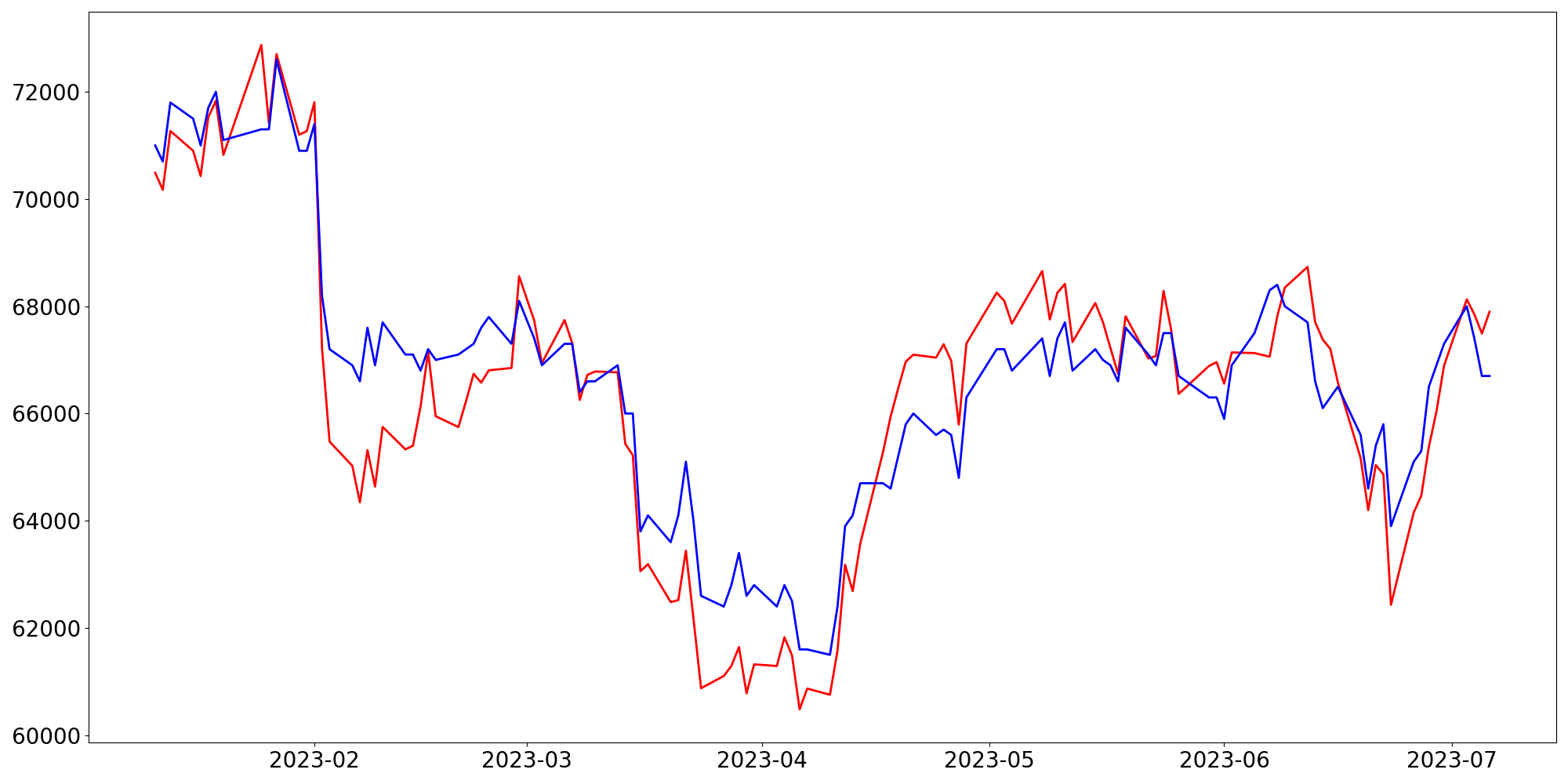 [ - : 실제값(종가) / - : 예측값(종가) ]