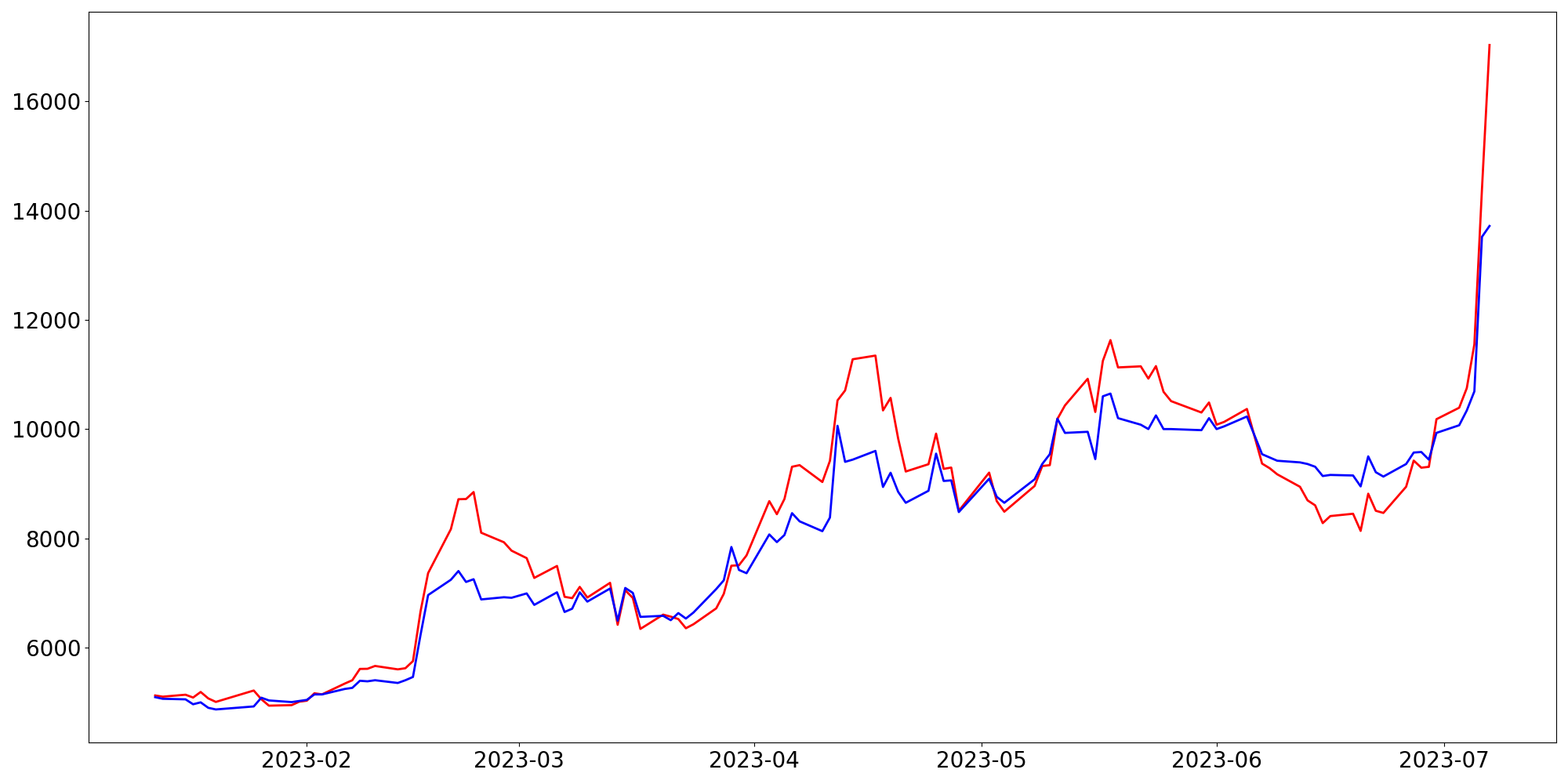 [ - : 실제값(종가) / - : 예측값(종가) ]