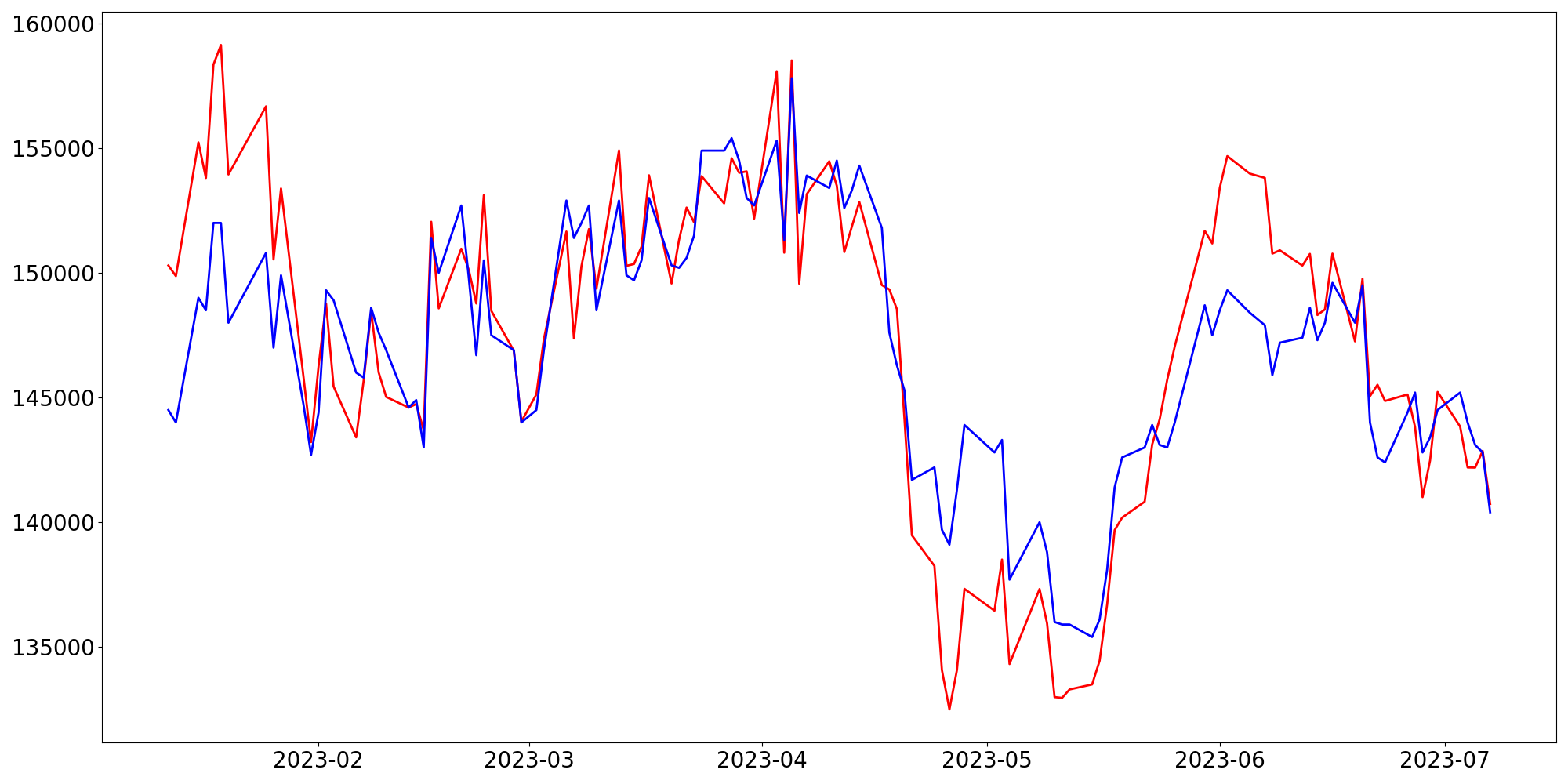 [ - : 실제값(종가) / - : 예측값(종가) ]