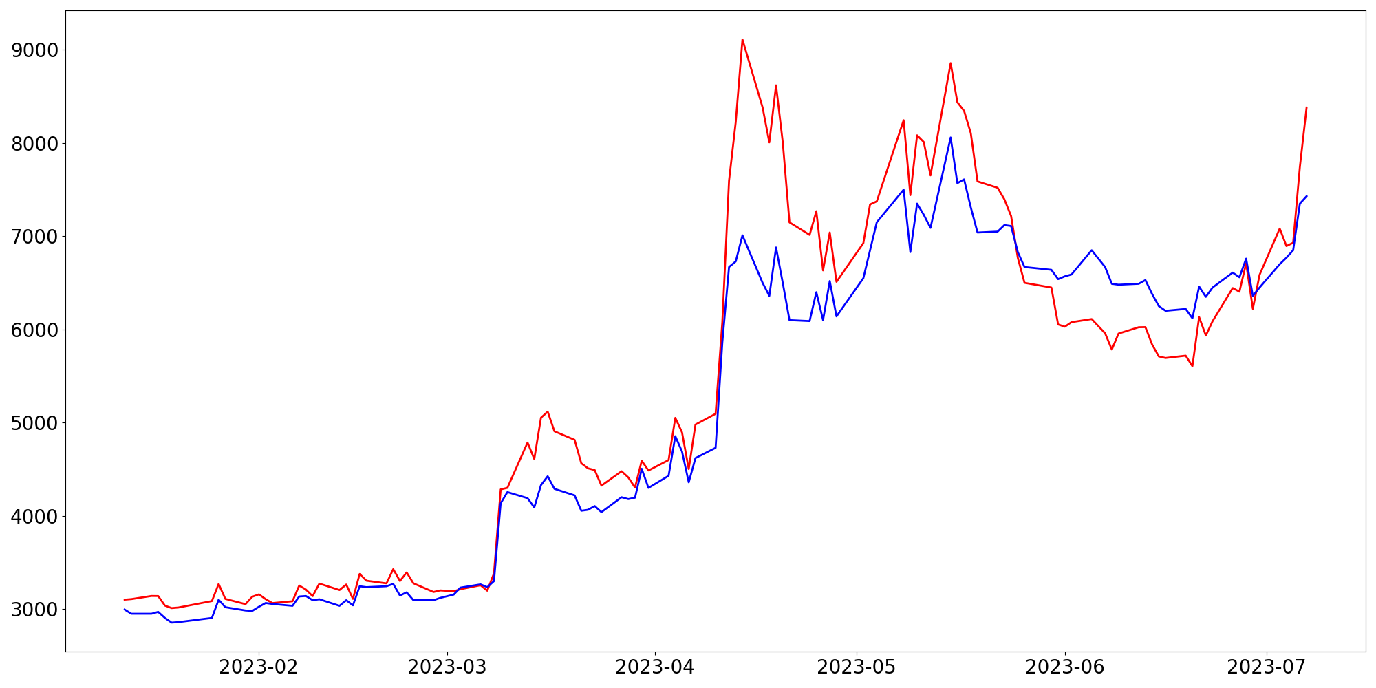[ - : 실제값(종가) / - : 예측값(종가) ]