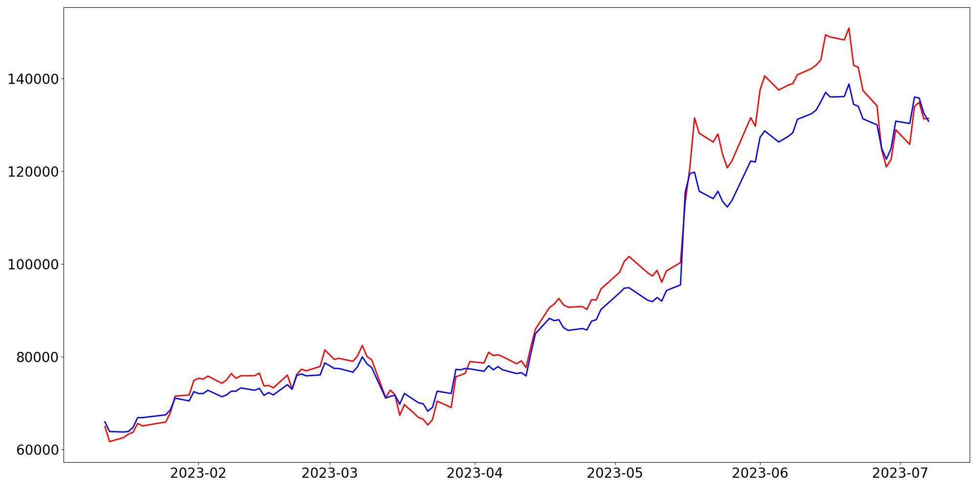 [ - : 실제값(종가) / - : 예측값(종가) ]
