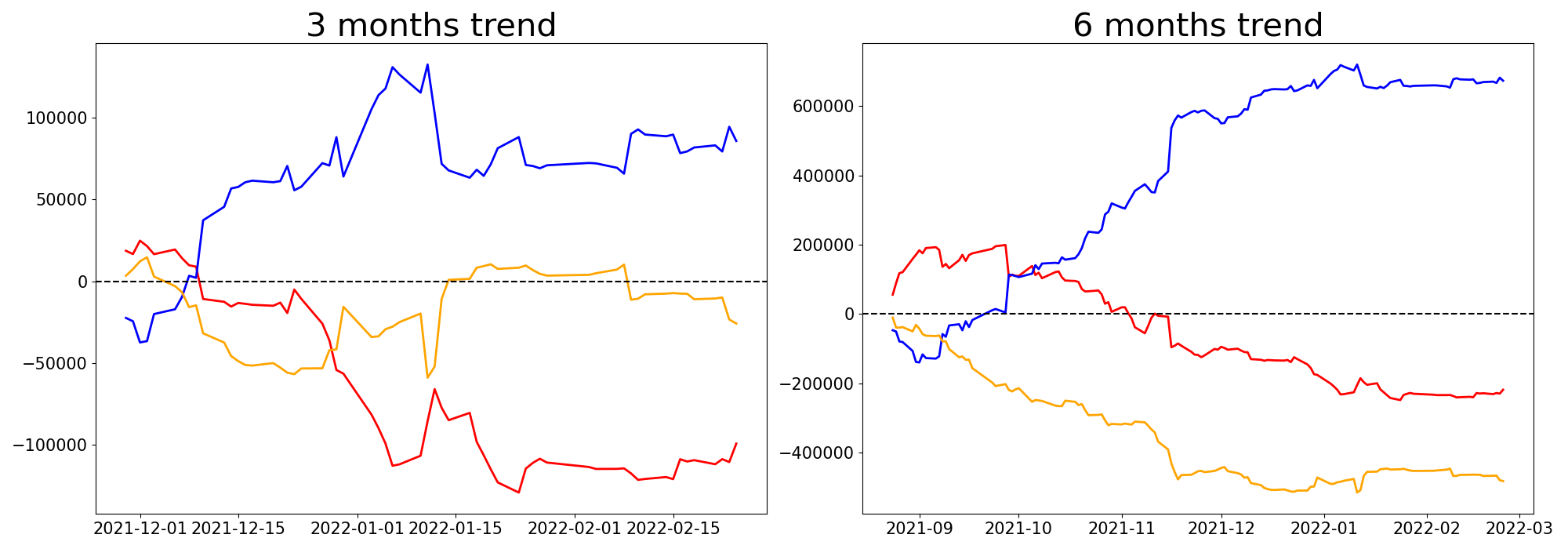 기관, 개인, 외국인으로 분류하여 투자주체별 일정기간동안의 누적적 매수/매도 현황을 분석한 내용입니다. 특정일의 투자자별 매매동향을 통해서 단기간의 시장충격여부를 판단할 수 있으며 장기적인 매매동향을 통해서 해당 종목의 장기 모멘텀을 판단해 볼 수 있습니다.