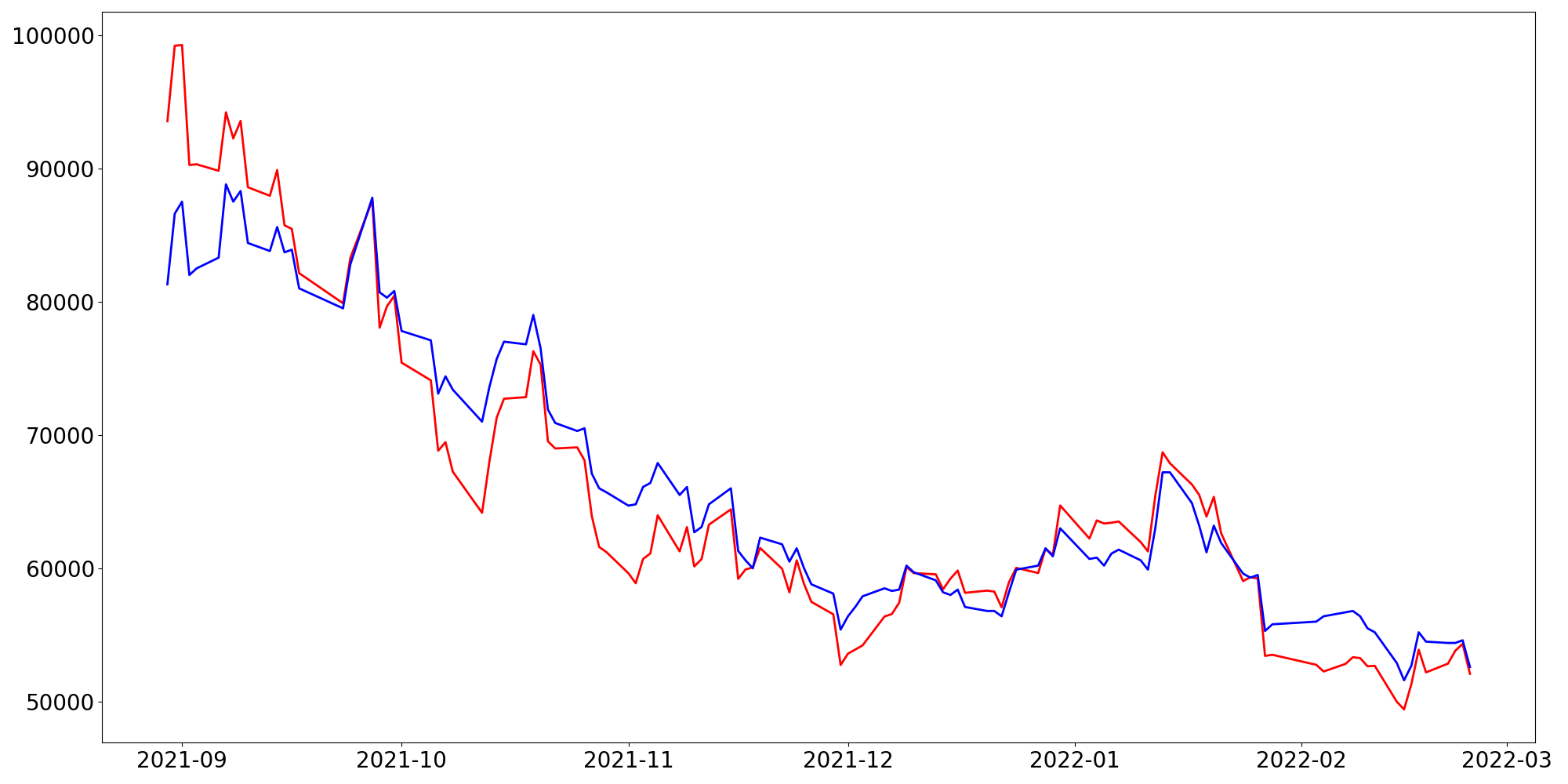 [ - : 실제값(종가) / - : 예측값(종가) ]