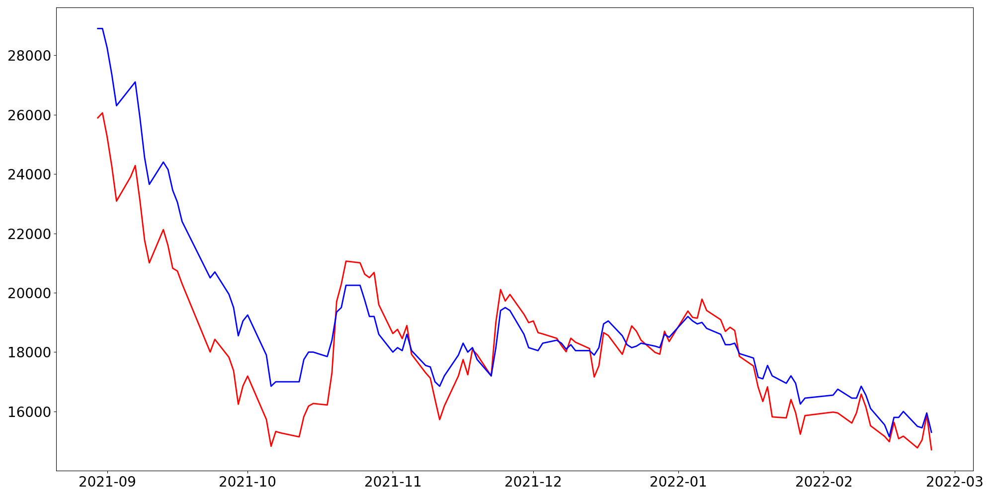[ - : 실제값(종가) / - : 예측값(종가) ]